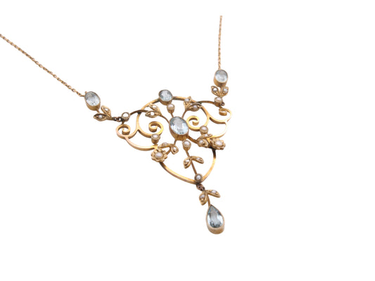 Edwardian 9ct Gold Aquamarine & Pearl Pendant Necklace