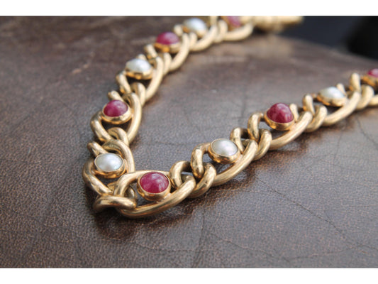 Antique 9ct Yellow Gold Ruby Cabochon Pearl Bracelet 1.75ct, 7.5"