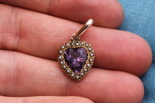 Antique 9ct Gold Amethyst Heart Pearl Pendant, 1.2ct