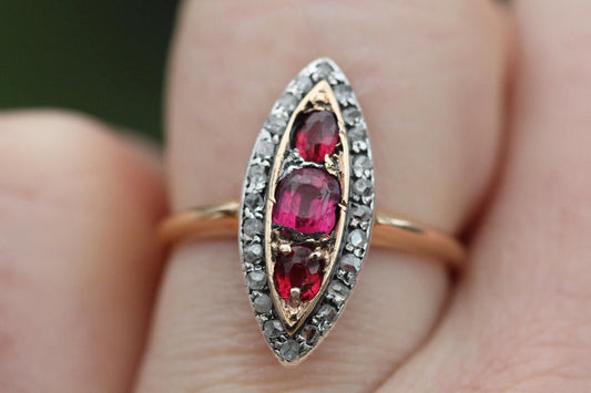 Antique 18ct Gold Garnet Diamond Navette Ring