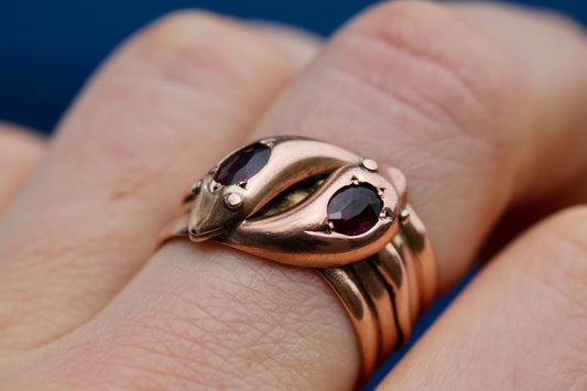 Antique 9ct Rose Gold Double Snake Head Garnet Ring, 1920
