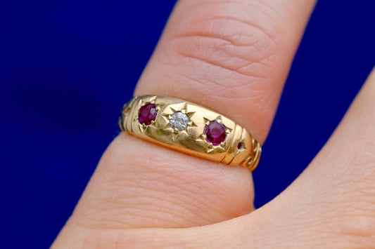 Antique 18ct Gold Diamond Ruby Gypsy Set Ring, 1915