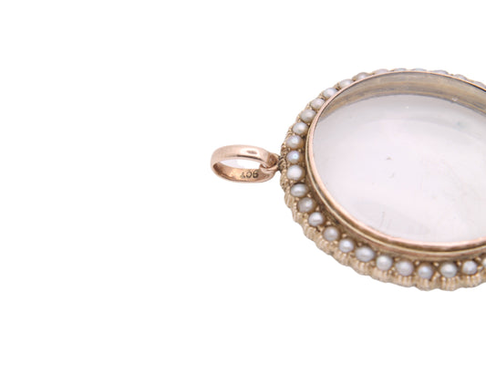 Antique 9ct Gold Seed Pearl Glass Photo Locket Pendant