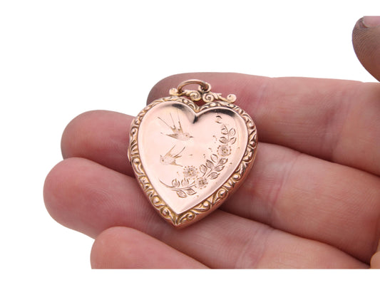 Antique 9ct Gold Large Decorative Heart Shaped Swallow Locket