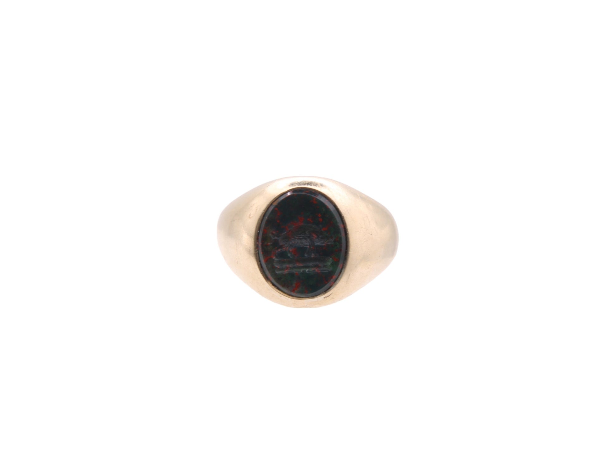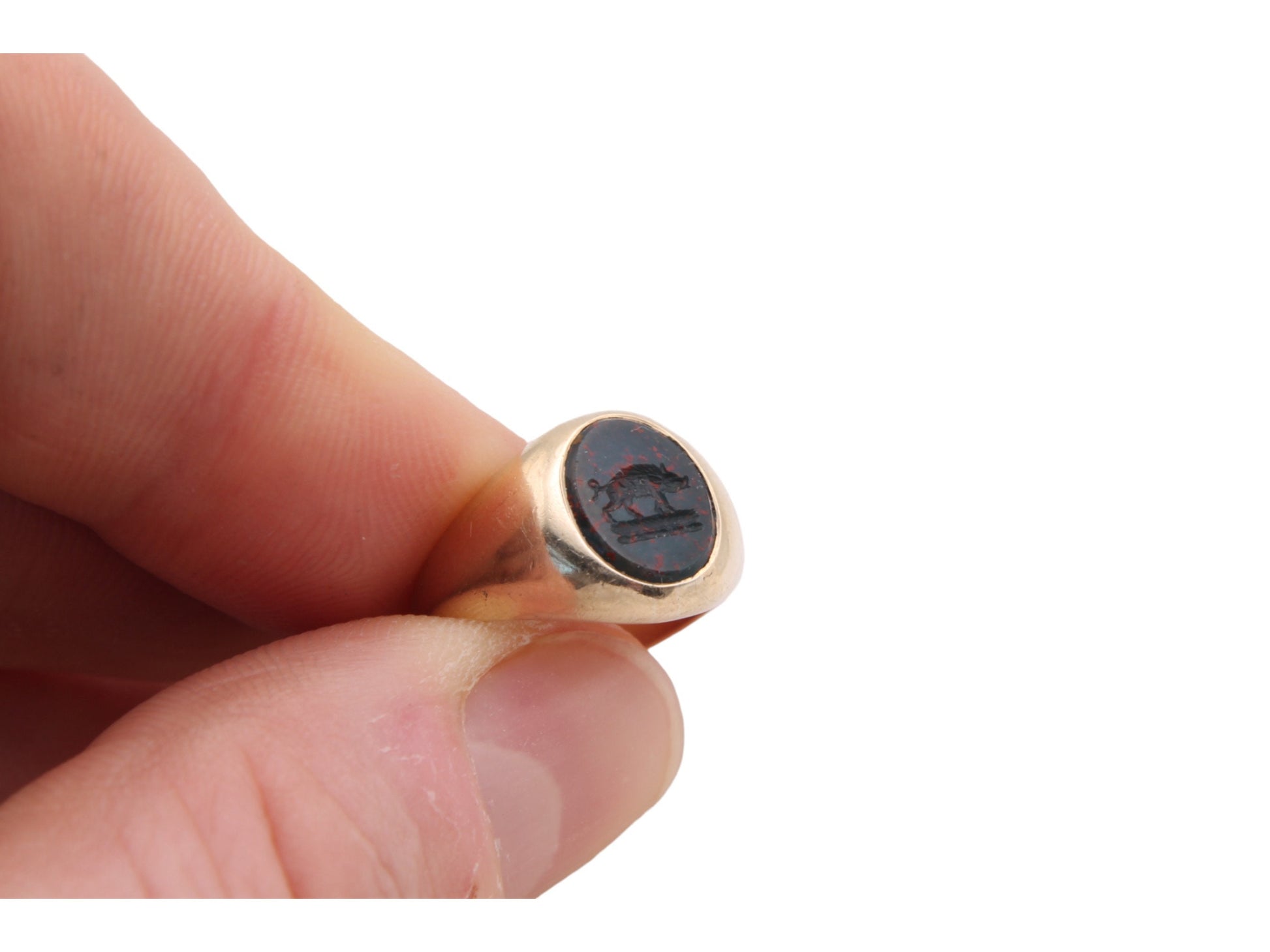 Antique 10ct Gold Bloodstone Intaglio Signet Ring Boar Crest