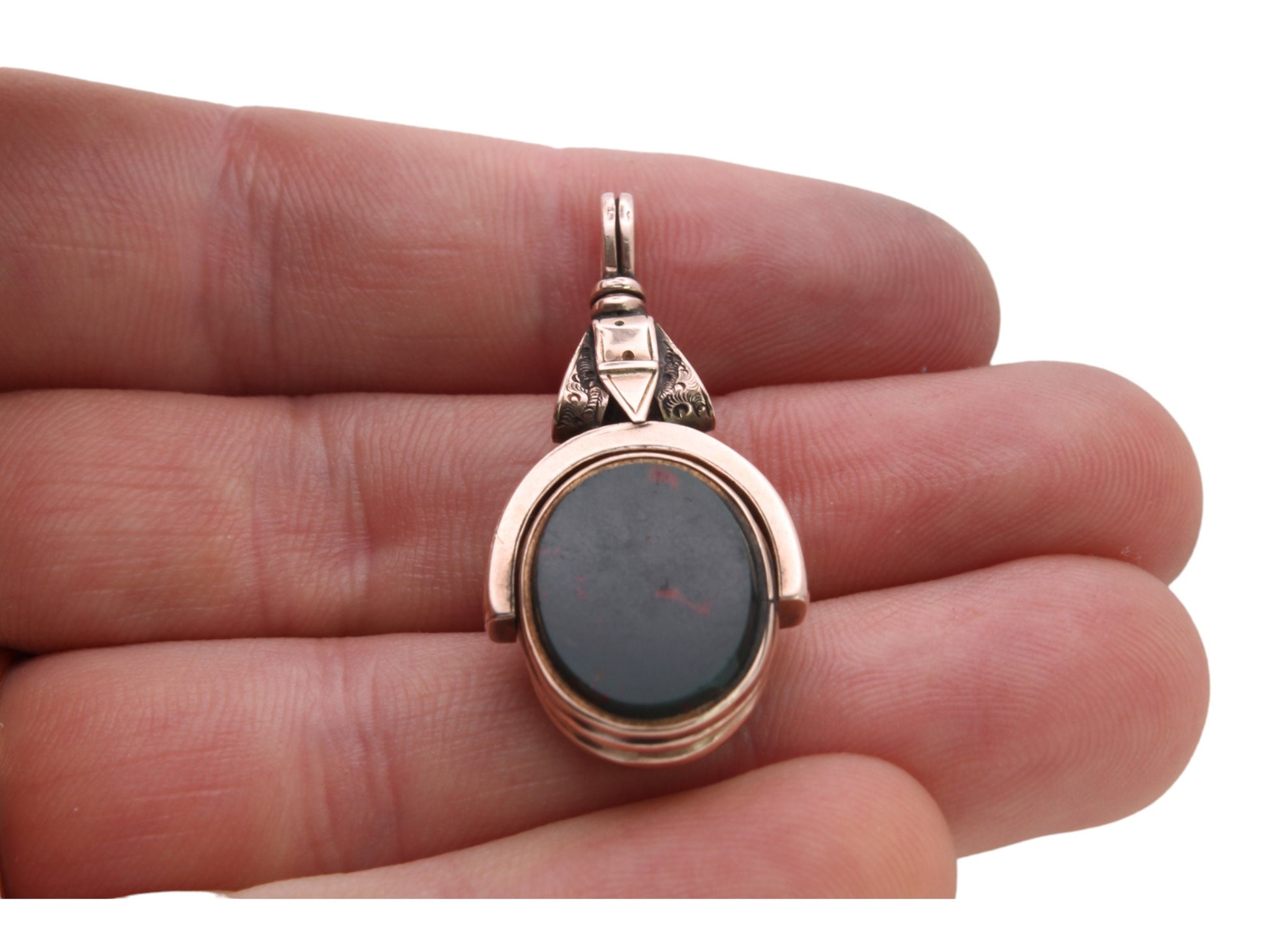The pendant spins freely and both the bloodstone and carnelian agate are in excellent condition.