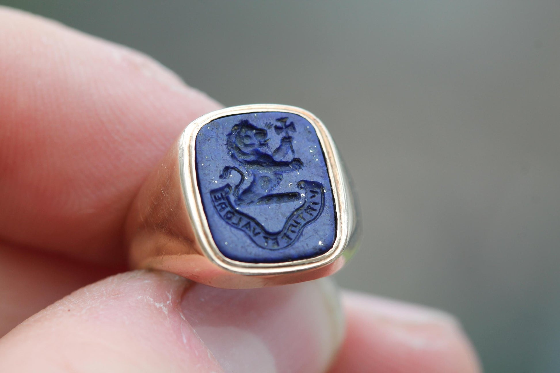 A distinguished antique 14ct gold signet ring crafted by Birks, dating to c.1910. The ring features a finely carved lapis lazuli intaglio depicting a lion rampant holding a cross, with the Latin motto “Virtute et Valore” (By Virtue and Courage) inscribed beneath. The rich blue of the lapis contrasts beautifully with the warm gold mount, giving this piece a striking presence. In lovely condition, this Edwardian signet ring is both a wearable jewel and a piece of heraldic history, showcasing the fine craftsmanship of Birks.