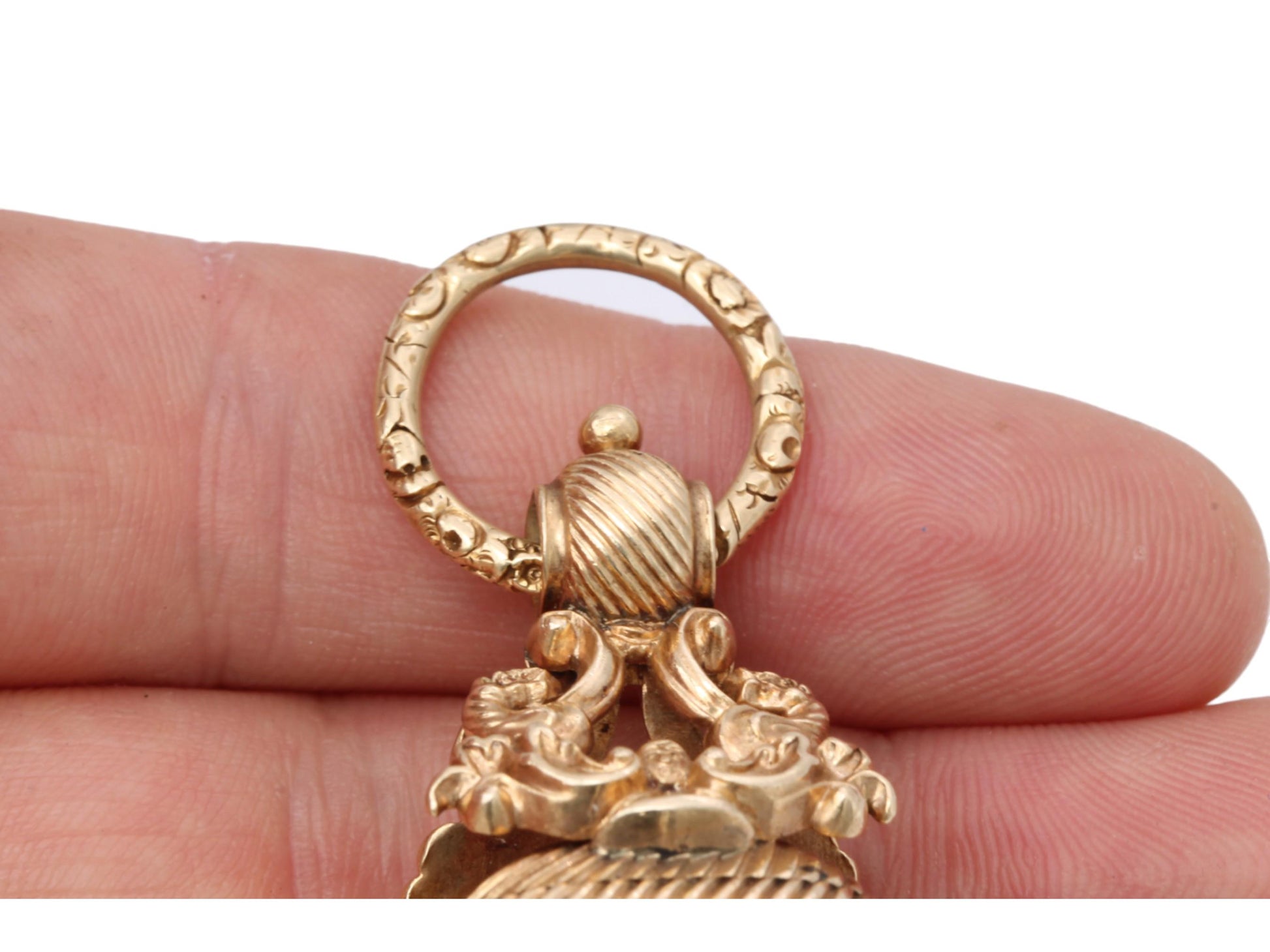 A magnificent antique 15ct gold intaglio seal dating to c.1860. The body is finely detailed, with chasing of a face to the centre, and two rising horses. This is mirrored both sides of the fob.