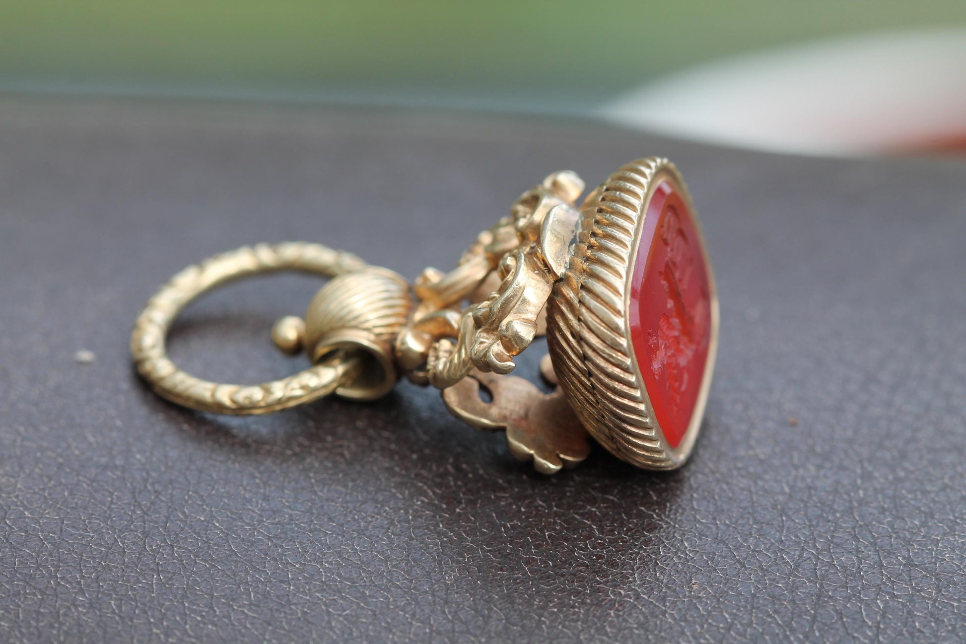 Antique 15ct Gold Carnelian Dragon Intaglio Crested Seal With Split Ring