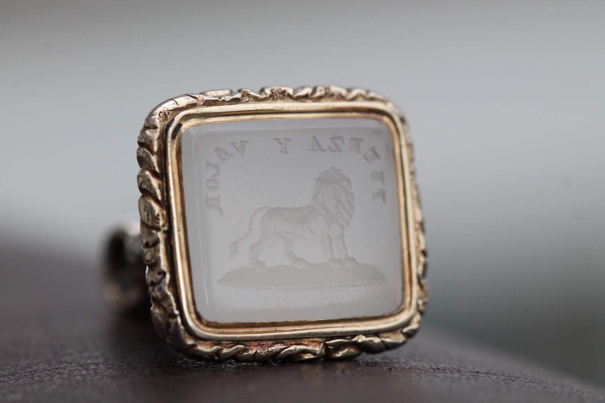 A fine early Victorian intaglio seal dating to c.1840, beautifully crafted in 15ct gold casing. The body is adorned with elegant floral gold work, leading down to a chalcedony intaglio base. The intaglio depicts a lion beneath the Spanish motto “Fuerza y Valor” (Strength and Courage), a powerful symbol of bravery and resilience.