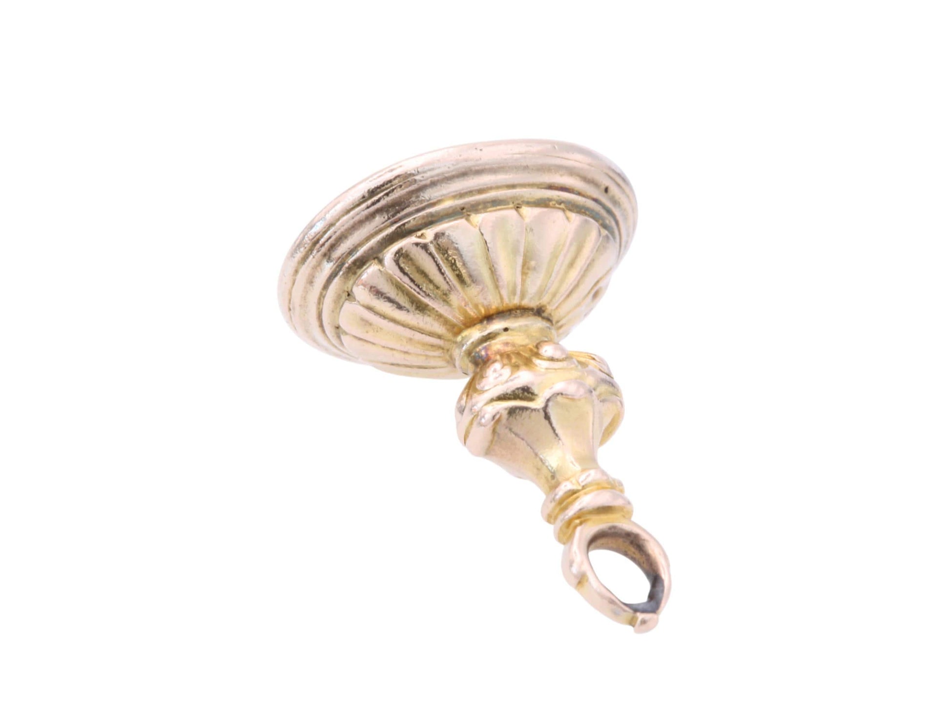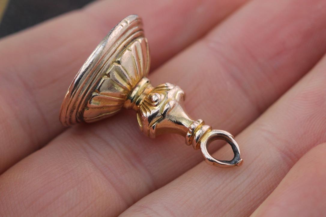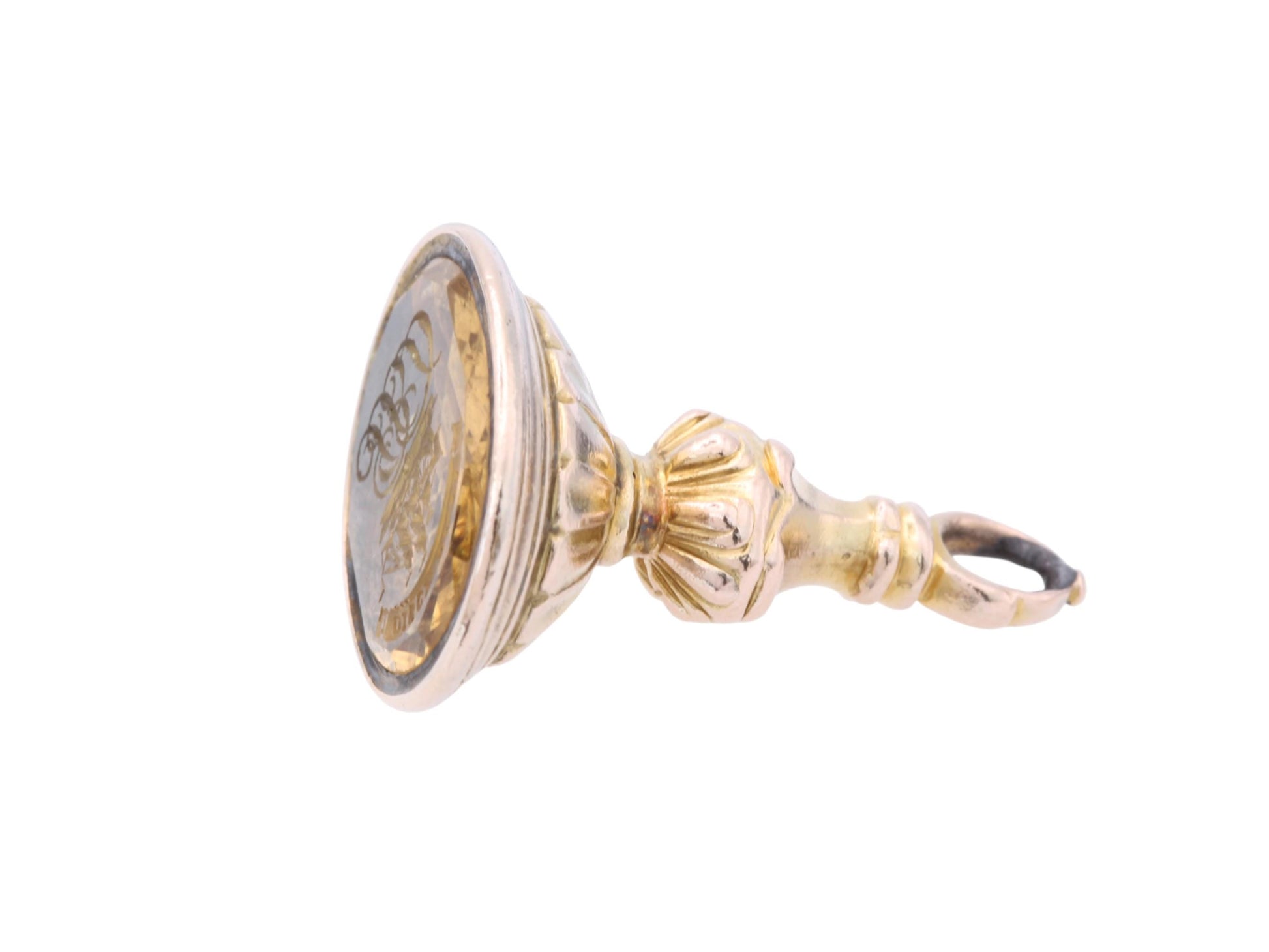 An outstanding and substantial antique 15ct gold Victorian-era fob seal, crafted with a high degree of quality and symbolism. The piece features a beautifully faceted, clear Citrine gemstone base which is expertly hand-carved with a deep intaglio design.