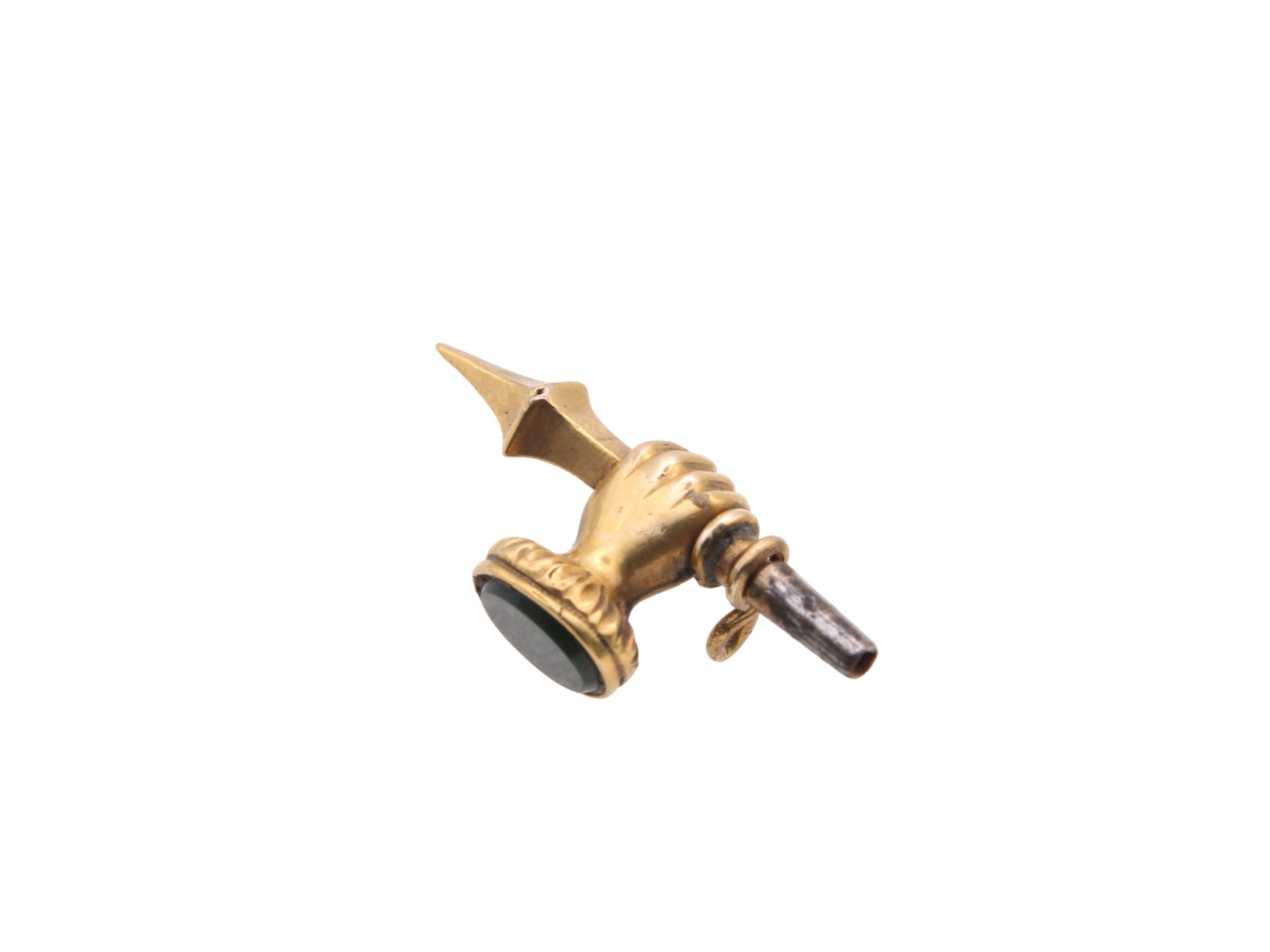 An exquisite 15ct gold antique pendant/watch key dating back to the Victorian era, c.1890. This stunning piece of jewellery is a true testament to the artistry of bygone eras, featuring a handcrafted hand clutching what looks to be a scepter or staff. It is adorned with a mesmerising bloodstone agate at its base.