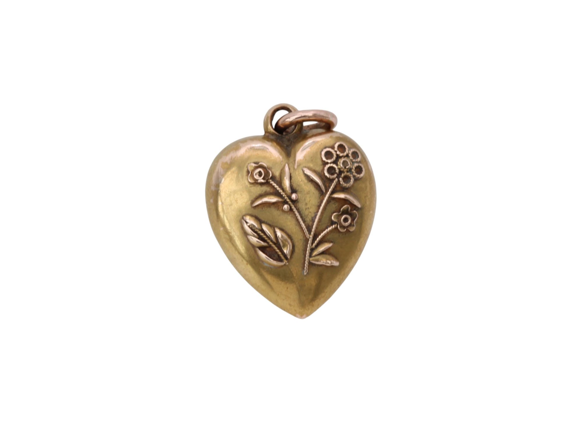 A charming antique 15ct gold heart pendant, dating to the late Victorian era, 1899. The front is beautifully decorated with applied gold work, forming a delicate flower motif that gives the piece a romantic and refined appeal. The heart is of hollow form, retaining a soft, lightweight feel, and the surface shows traces of high-carat gilding — with gentle wear to the reverse adding character to its antique patina.