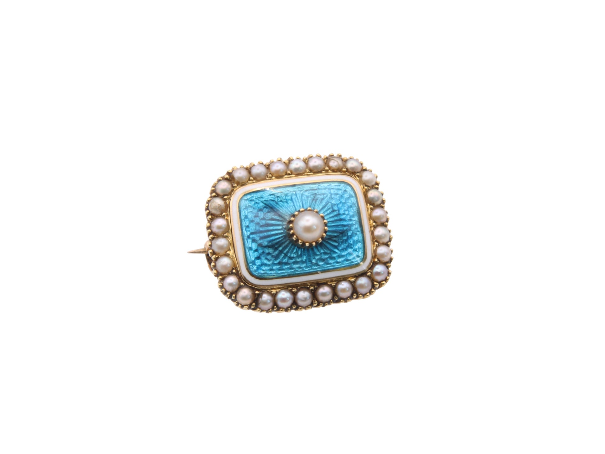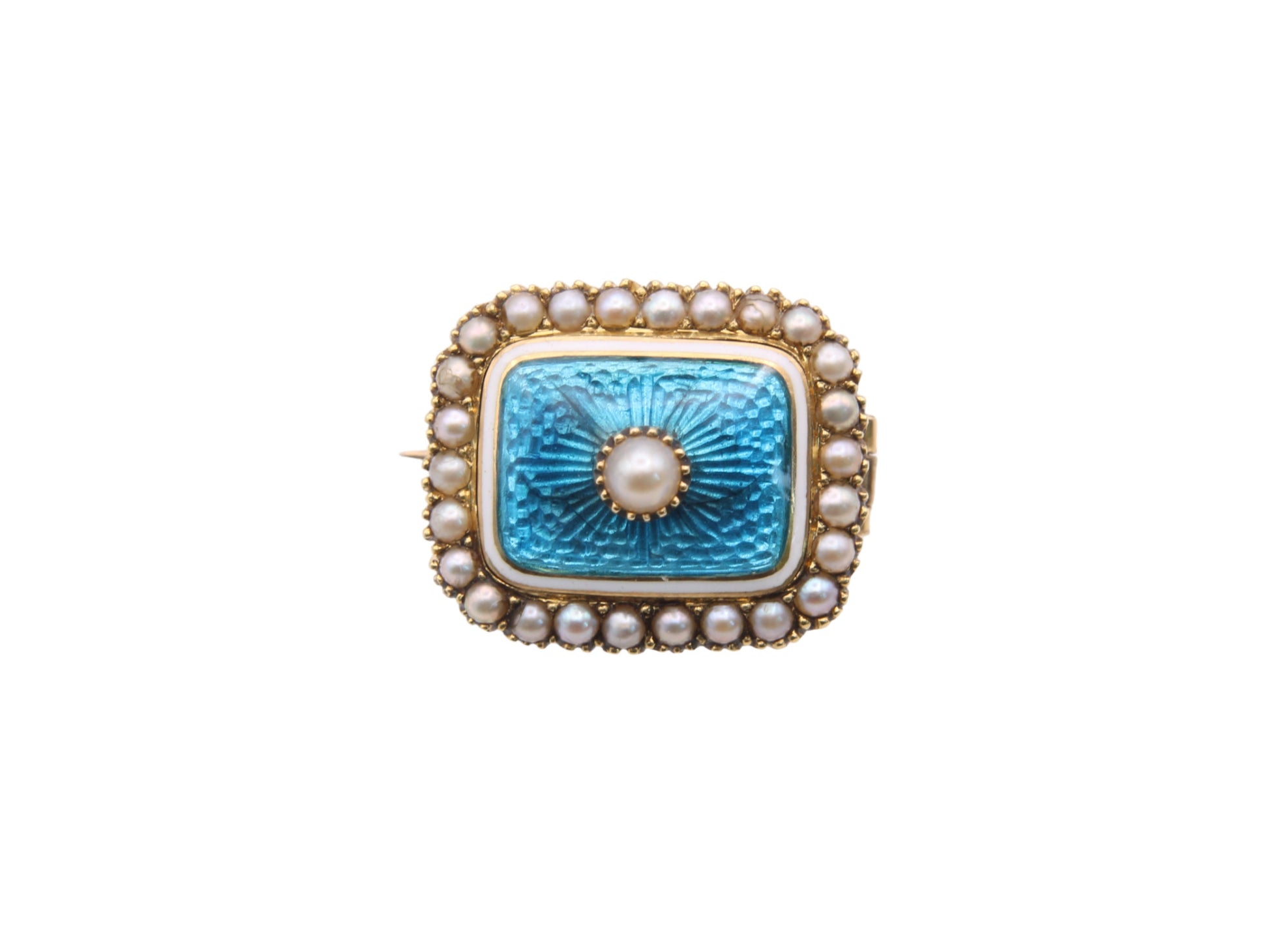 Antique Victorian 15ct gold brooch with divine blue guilloche enamel, surrounded by seed pearls. This exceptional antique is a true one of a kind with such beauty and elegance.