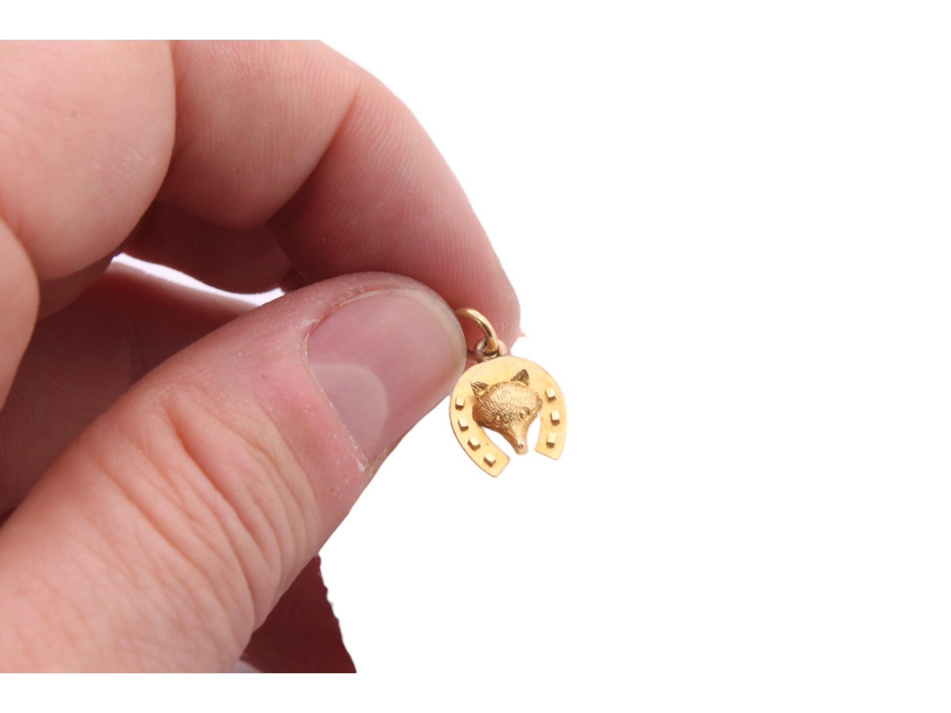 A delightful antique 15ct gold lucky horseshoe charm with the sweetest fox peering through the centre.