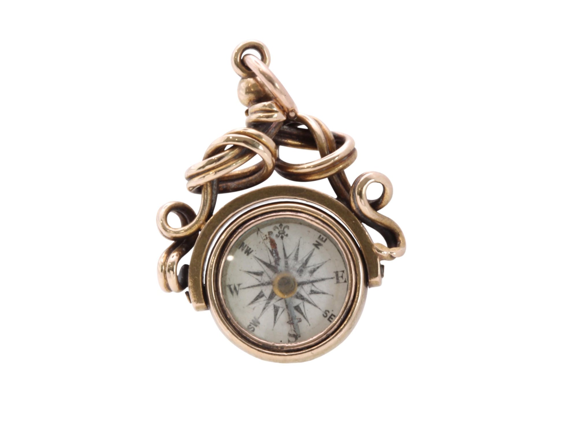 A wonderfully unusual and highly collectable antique 15-carat gold spinner pendant, combining a working compass on one side and a bloodstone intaglio on the other. Crafted in the late Victorian era, the pendant features an ornate scrolling gold mount with beautifully hand-formed loops and detailing, and the spinner turns freely as intended.