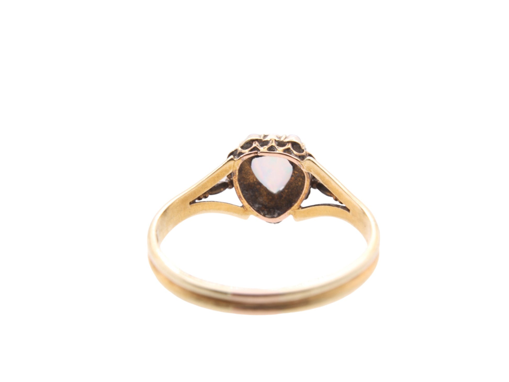 An exquisite antique 15ct gold heart opal ring adorned with pearls encircling the captivating heart-shaped centerpiece.