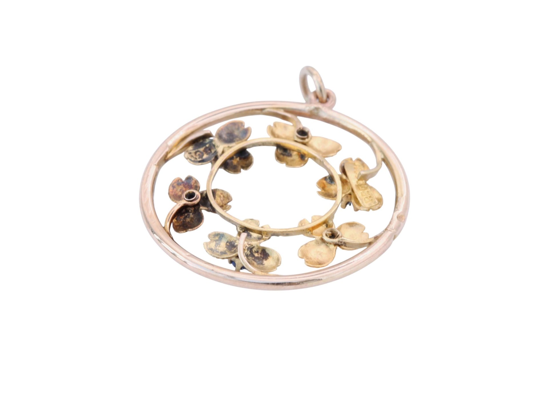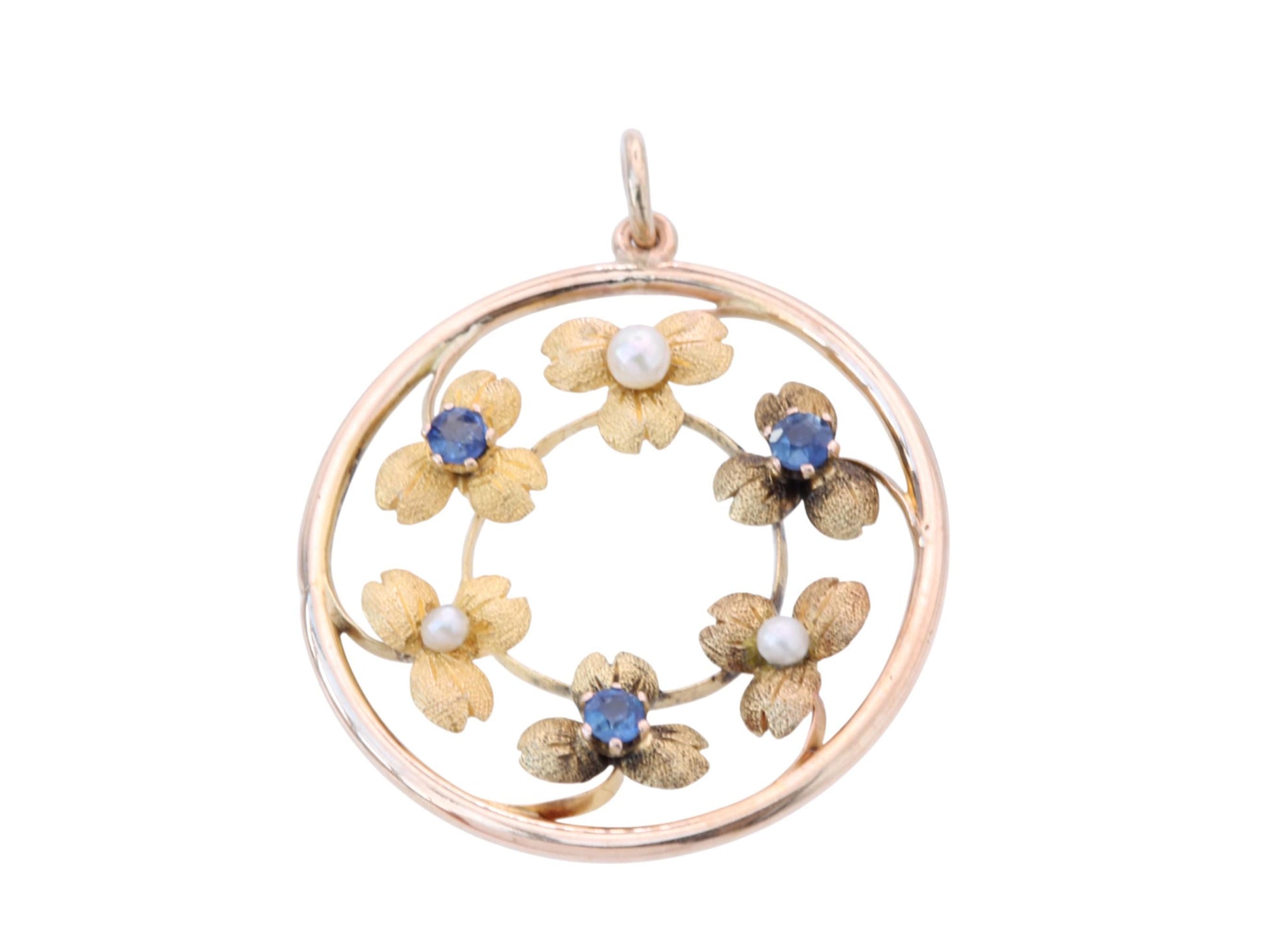 An enchanting antique 15ct gold pendant adorned with a delicate floral motif, a beautiful example of turn-of-the-century craftsmanship. Surrounded by flowers and alternating with blue sapphires and pearls it creates a gentle rhythm of light and colour.