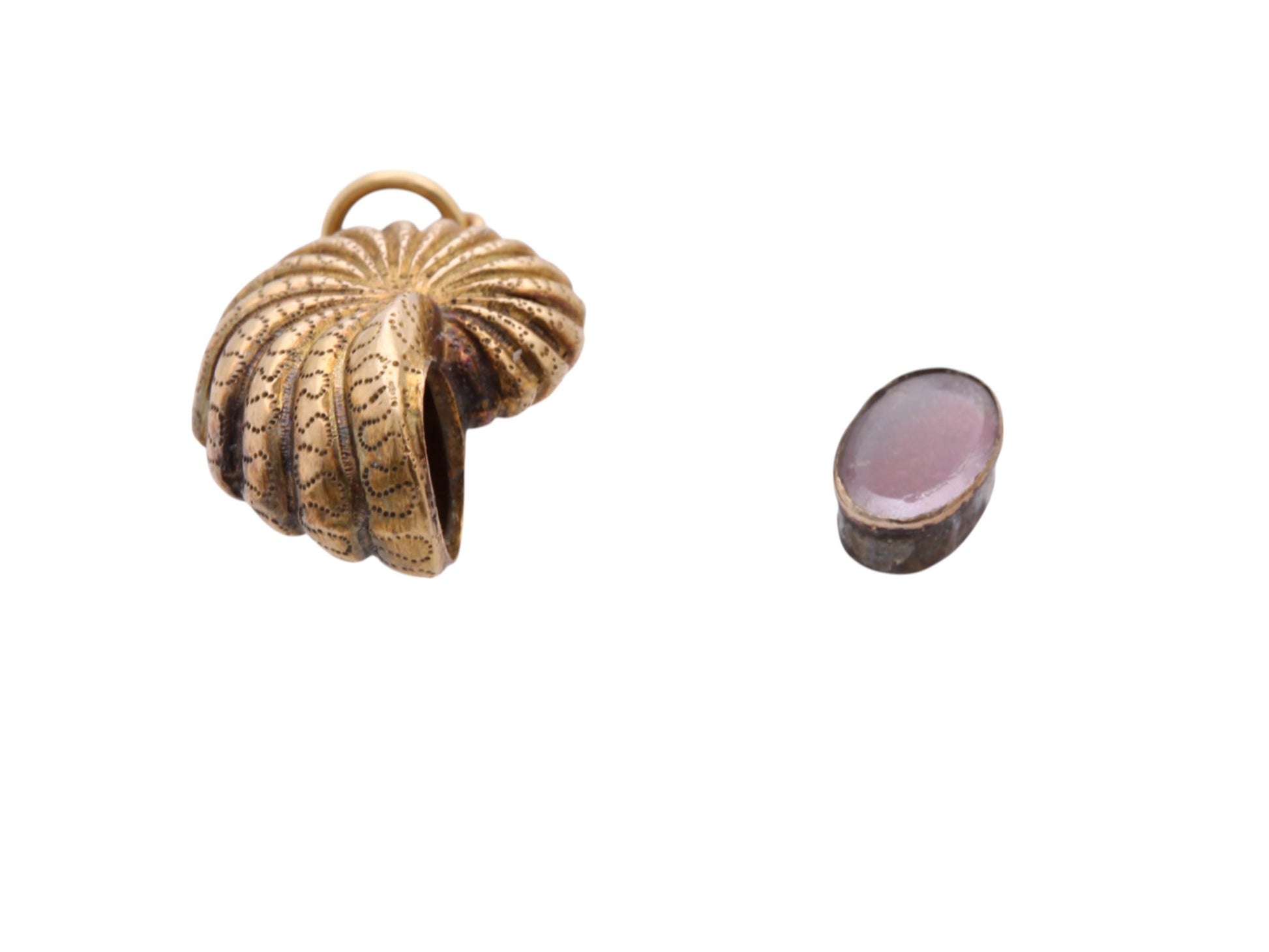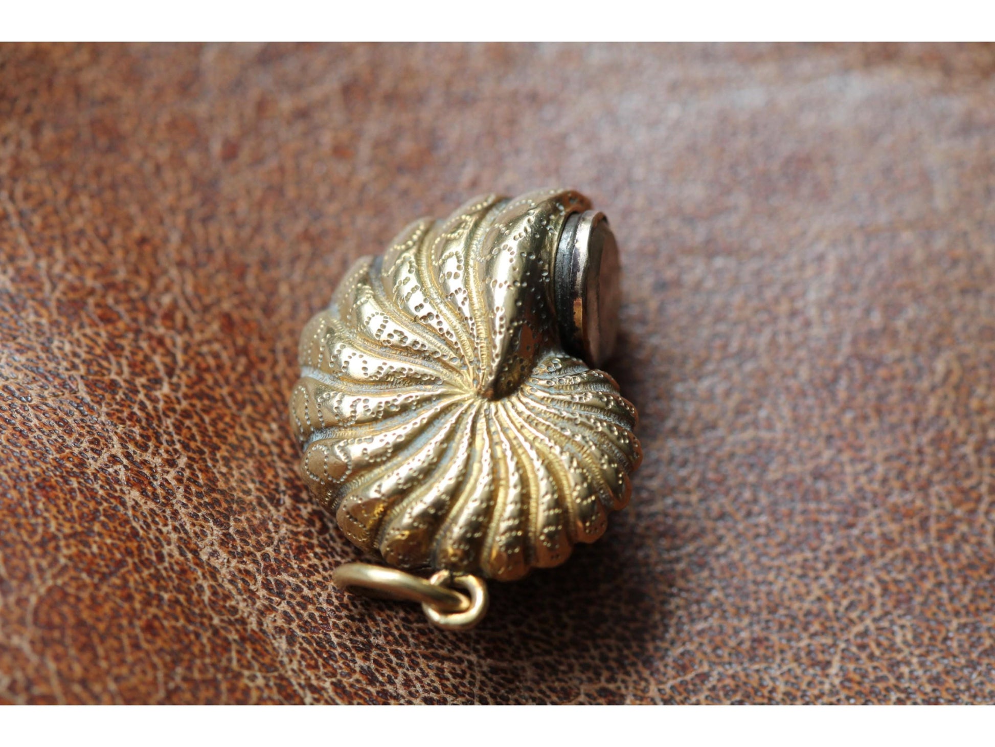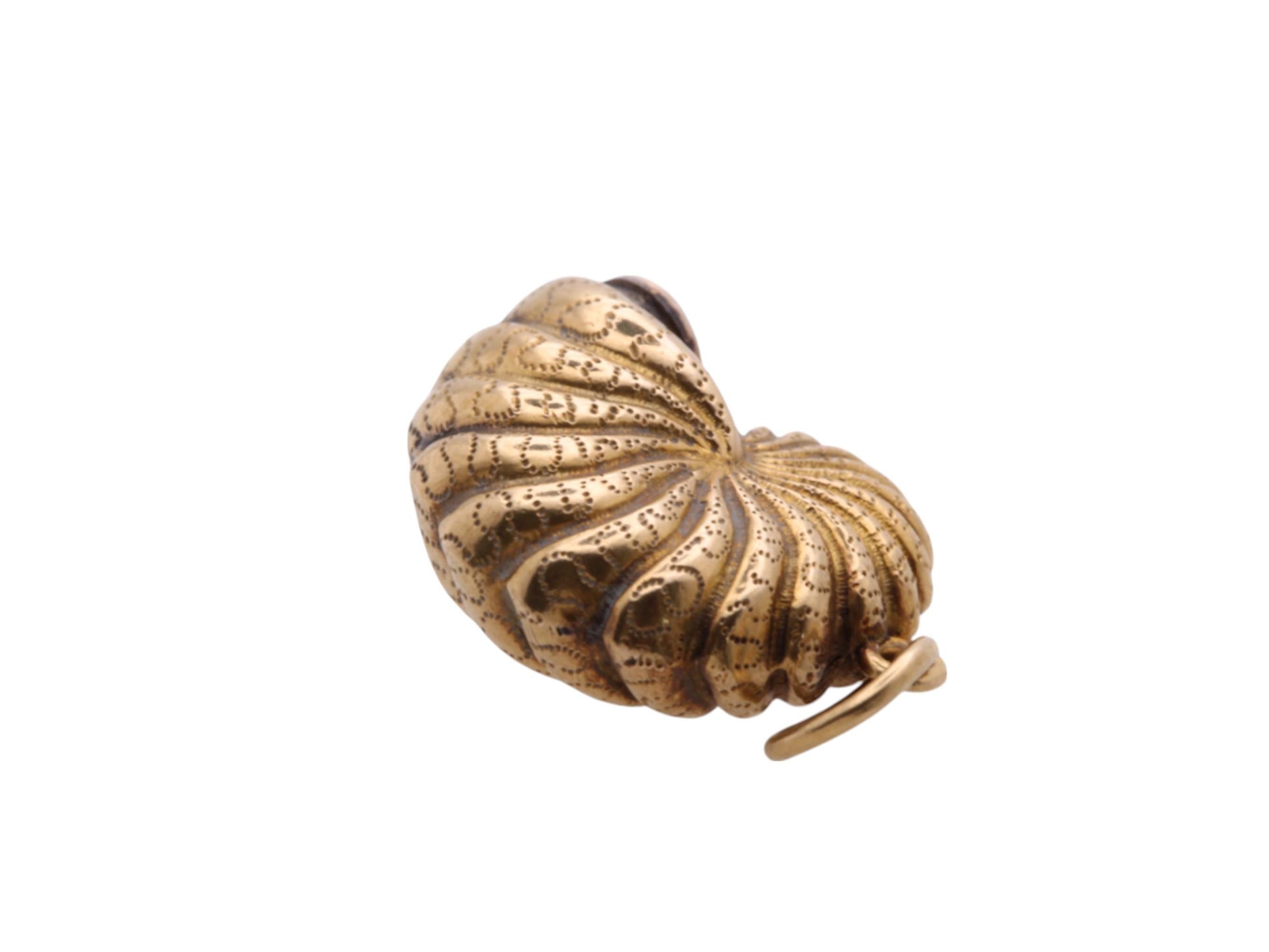 A rare and beautiful antique 15ct gold shell-shaped pendant dating to circa 1860. Expertly crafted, this charming pendant features intricate chased detailing across its golden surface, evoking the organic texture of a real shell.