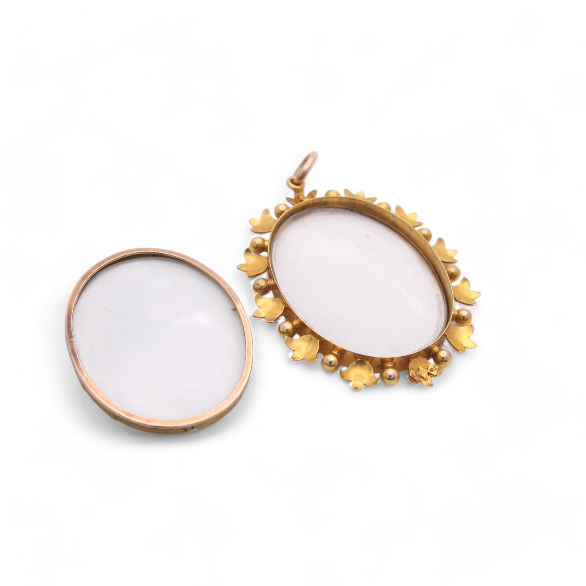 This exquisite antique 15ct gold pendant features a beautifully crafted design, showcasing a stunning glass front and back perfect for storing precious keepsakes or photographs. The pendant’s outer 15ct gold mount is elegantly adorned with delicate tulip motifs, adding a touch of floral charm to the piece.