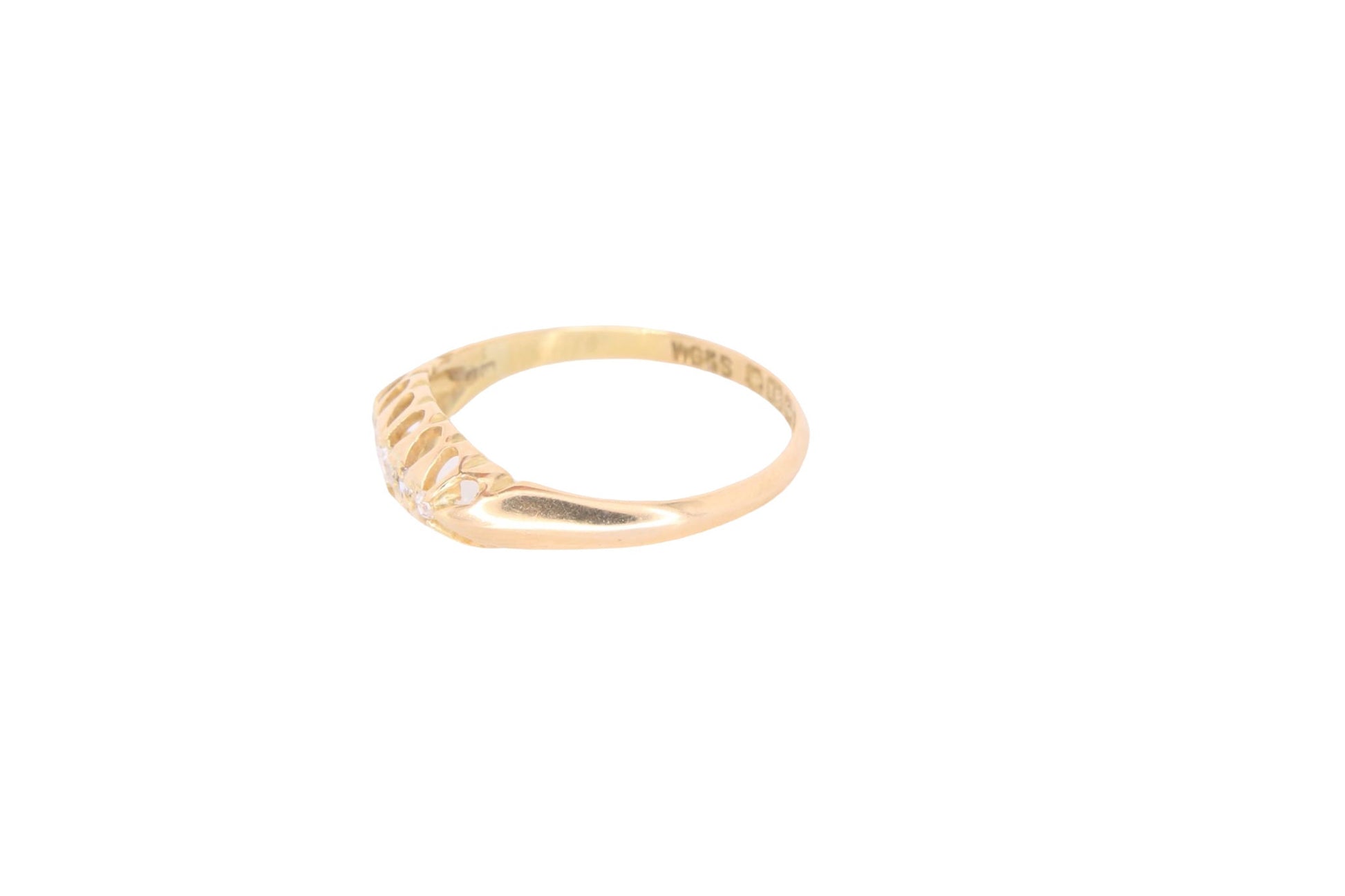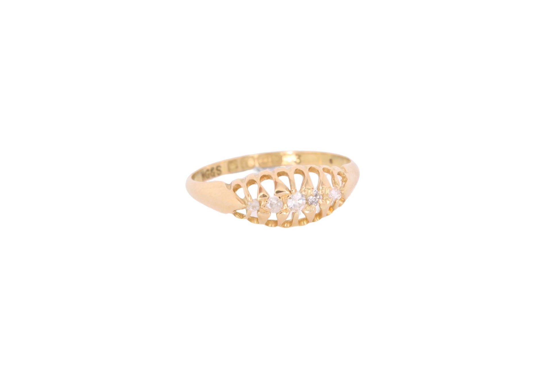 A pretty antique 18ct gold and diamond ring dating back to 1921. A simple yet elegant design with the diamonds mounted in a claw setting. Each diamond is of nice clarity, and although small, still gives a lovely sparkle!