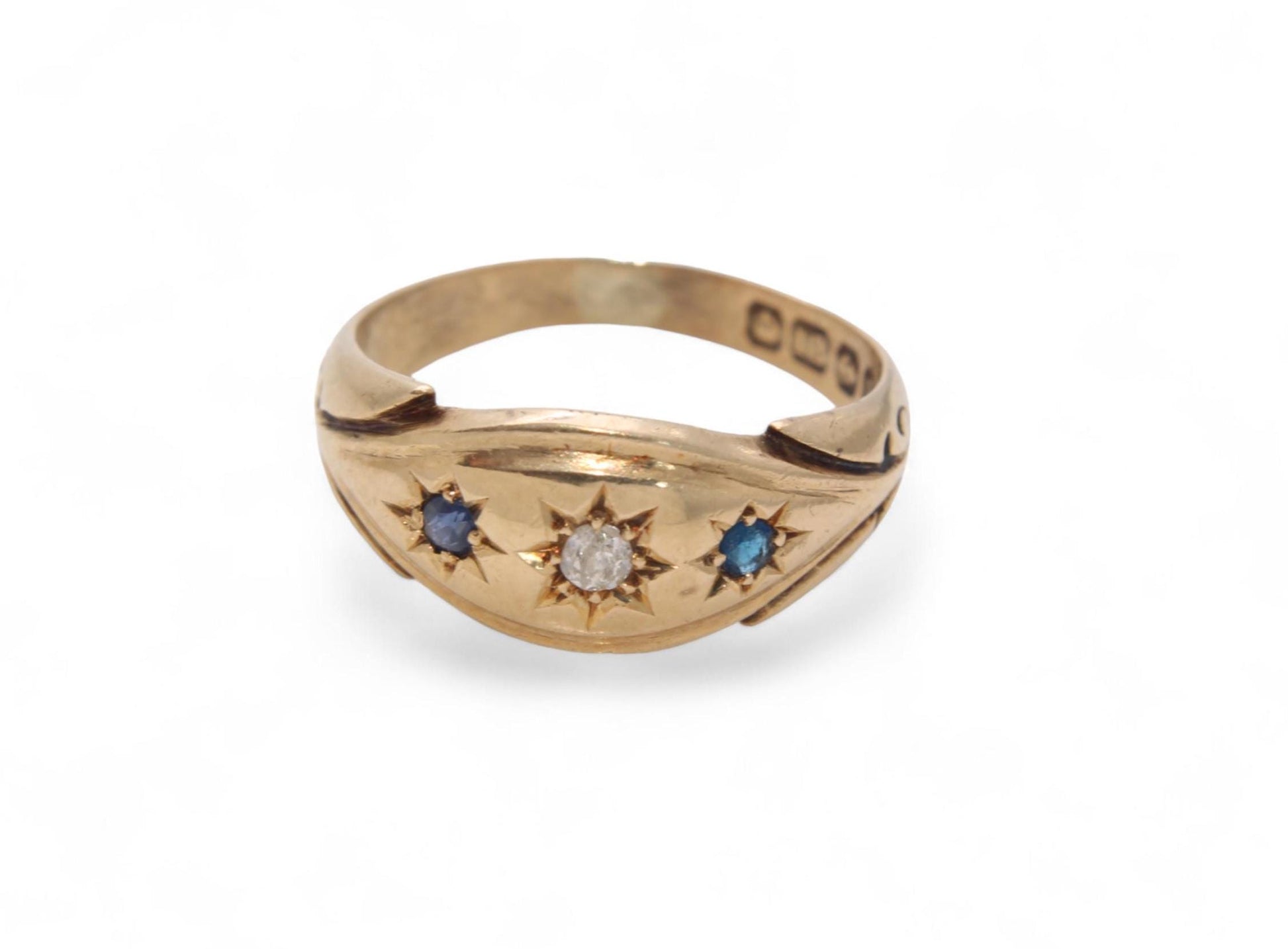 A beautiful antique 18ct yellow gold gypsy ring, dating to 1914. At its centre sits a bright old European cut diamond, approximately 0.03ct, star-set into the gold. On either side is a rich blue sapphire, creating a classic and balanced design.