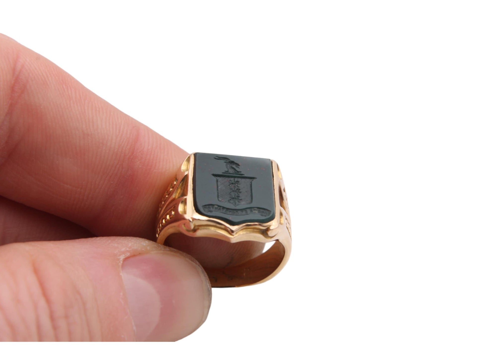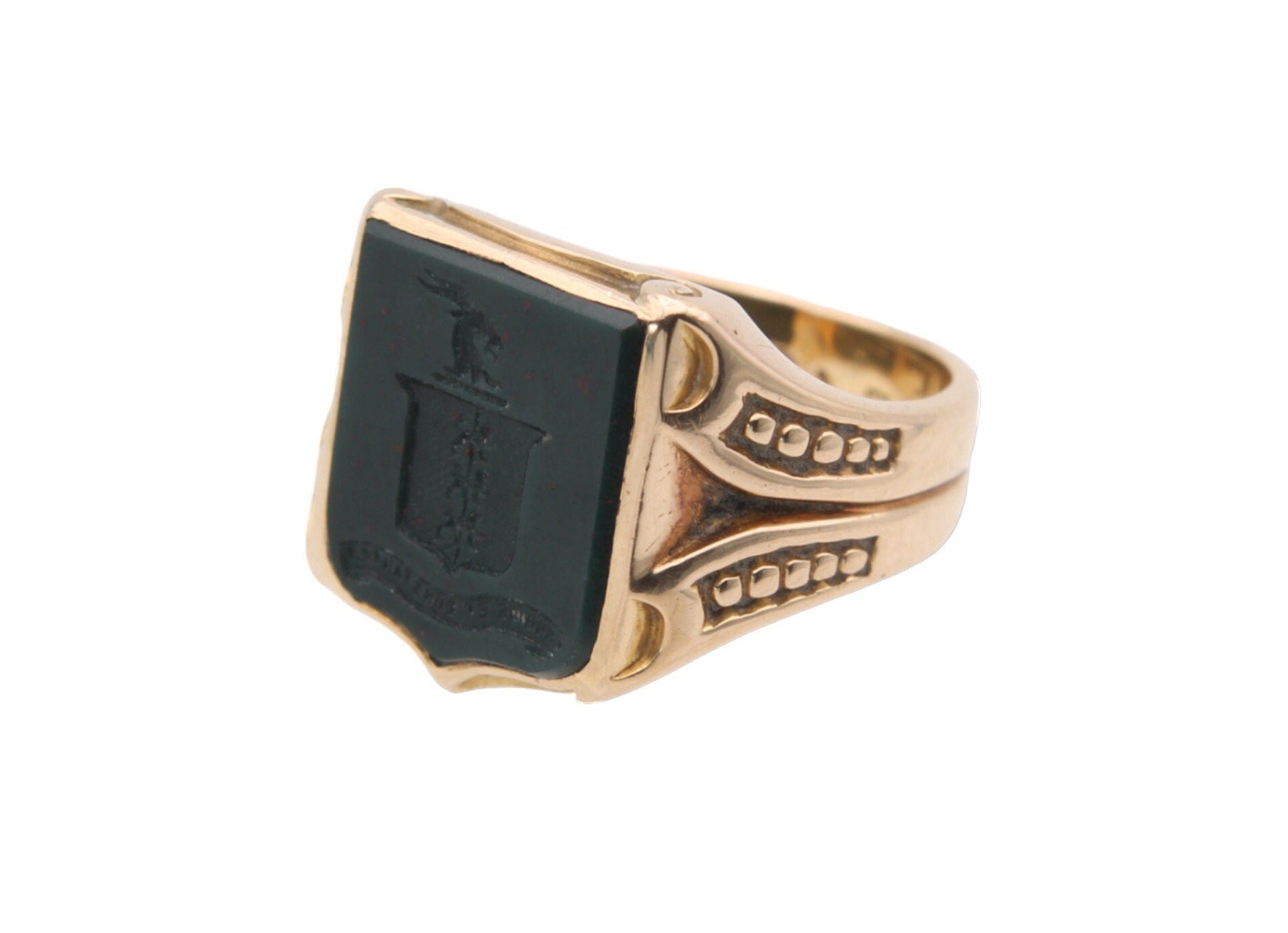 Antique 18ct Gold Intaglio Bloodstone Shield Signet Ring - Fairly And Firmly, 1869