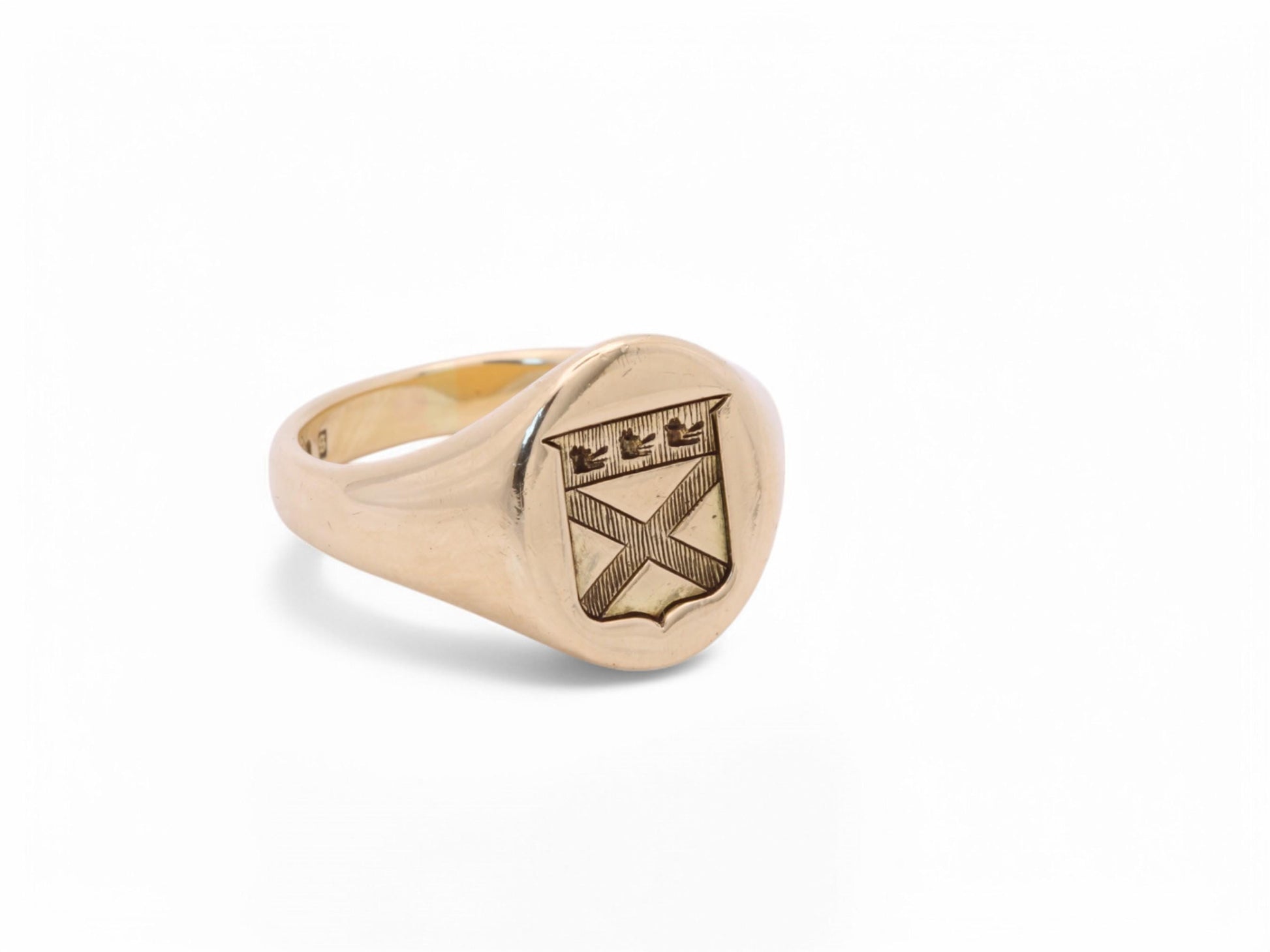 An exceptional antique Victorian 18ct yellow gold signet ring, dating to 1873. This striking piece features an intricately carved intaglio of a heraldic shield, with a bold cross running through it. At the top of the shield sit three finely detailed wolves' heads.