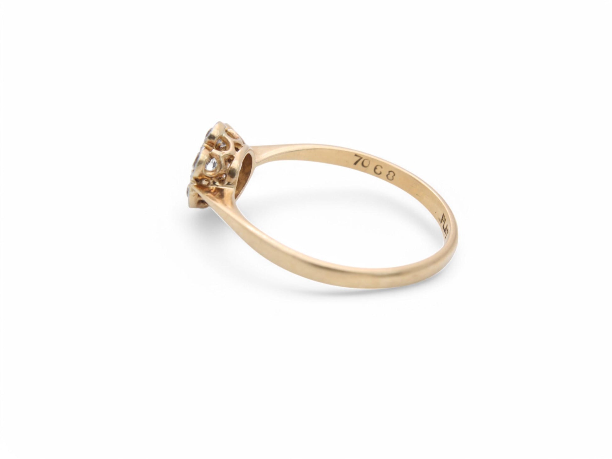 This antique 18ct gold old European cut diamond cluster ring, dating to circa 1920, is a stunning example of Art Deco elegance. Designed in a classic daisy formation, it features six sparkling .005ct diamonds encircling a 0.3ct central diamond, creating a beautiful floral-inspired display of brilliance.