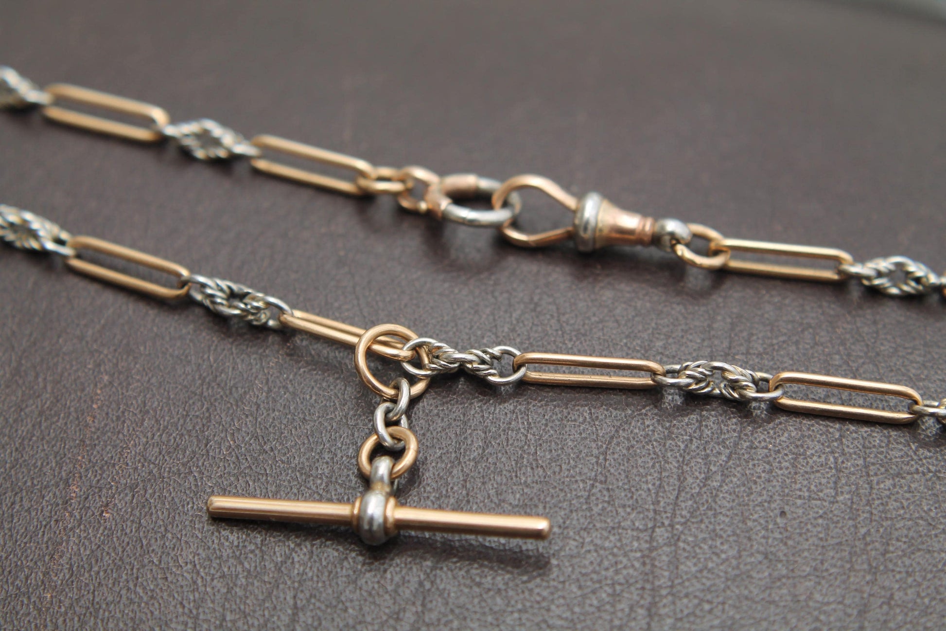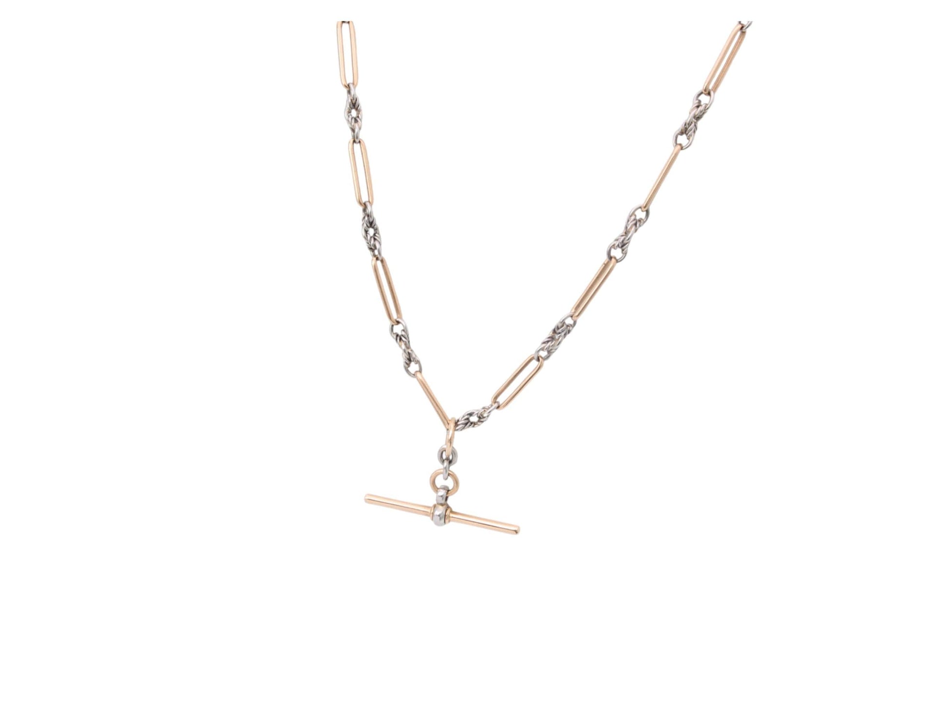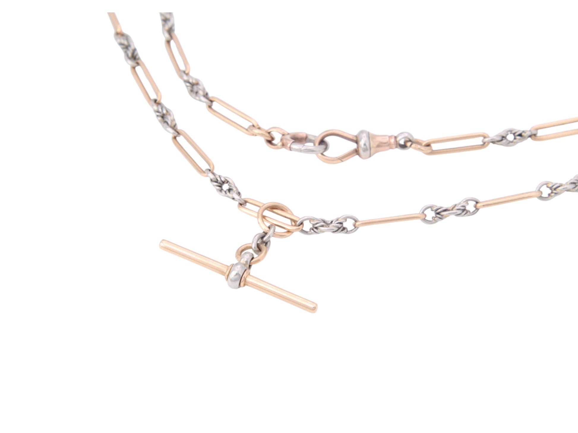 An exceptional antique Art Deco double Albert chain crafted in 18ct gold and platinum. The alternating trombone links, modelled in rich 18ct gold, are paired with elegant lovers’ knot links in platinum, creating a striking two-tone design typical of the period. At each end sits a dog clip and a bolt clasp, with a T-bar suspended from a larger jump ring, allowing it to slide freely and be positioned anywhere along the chain. A versatile and beautifully made Albert chain in lovely condition, perfect as a watch chain or statement necklace.