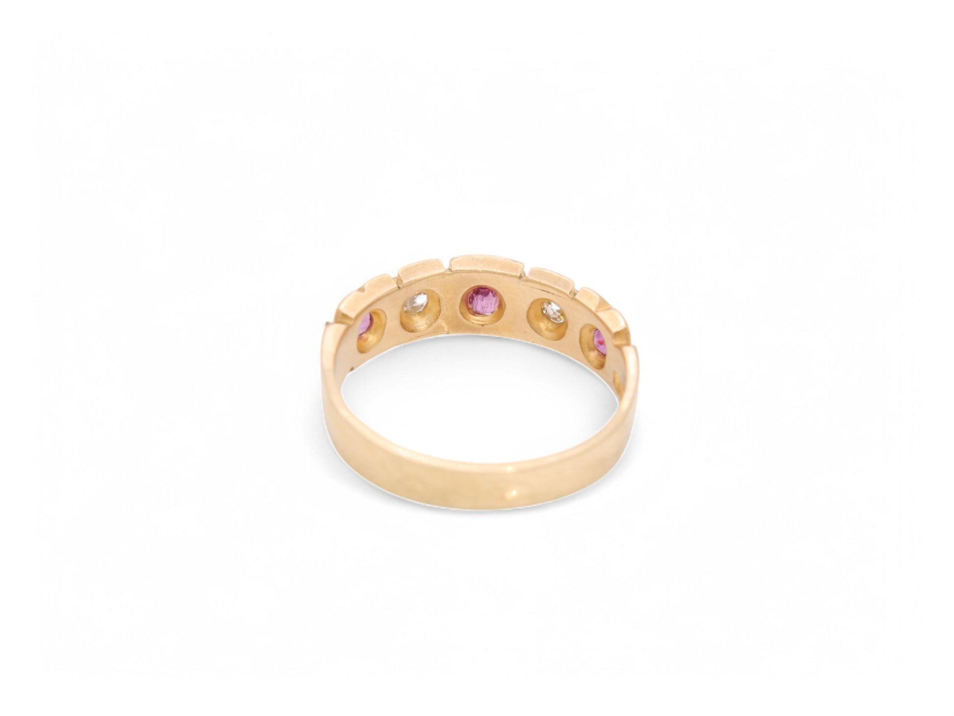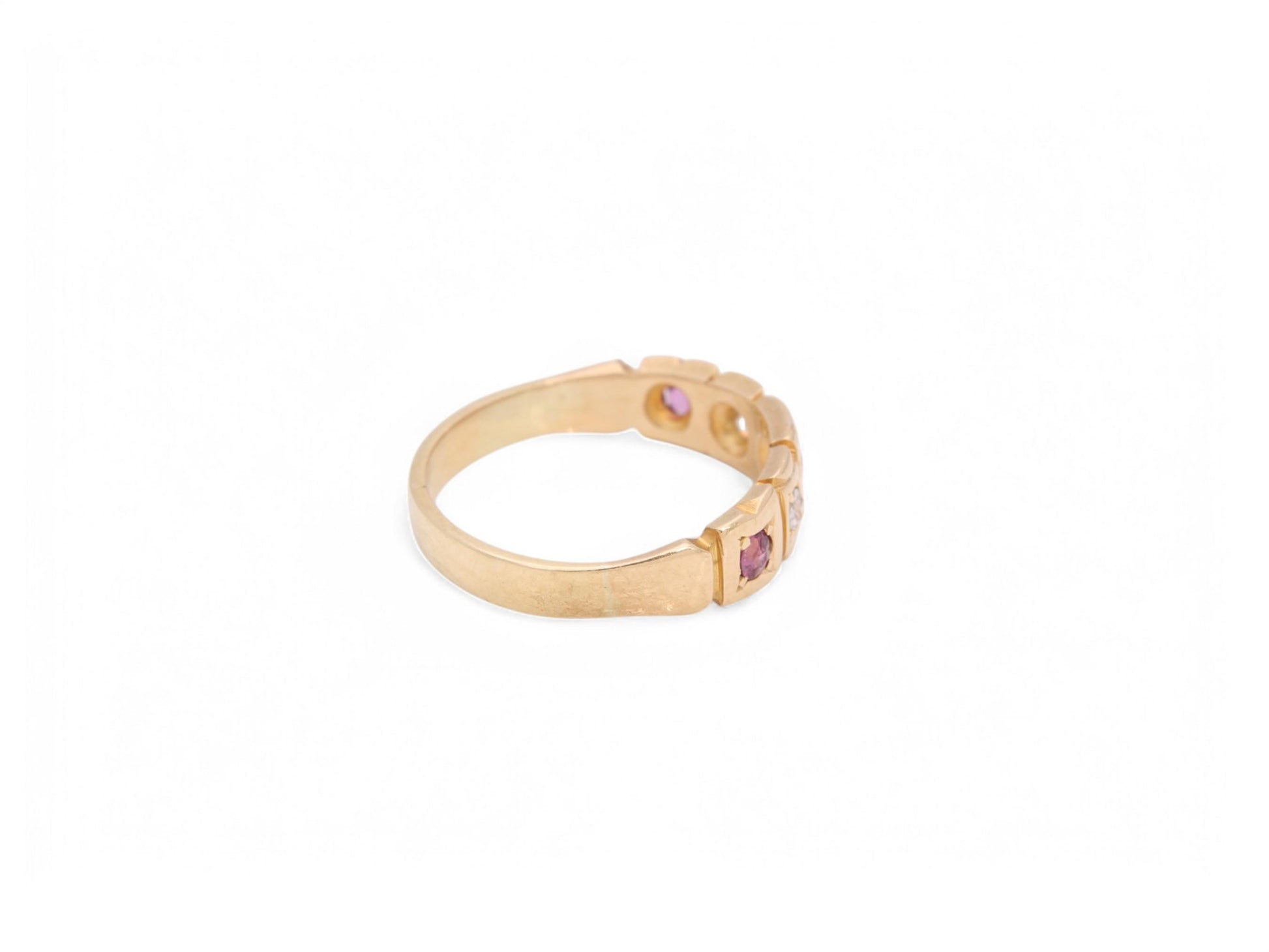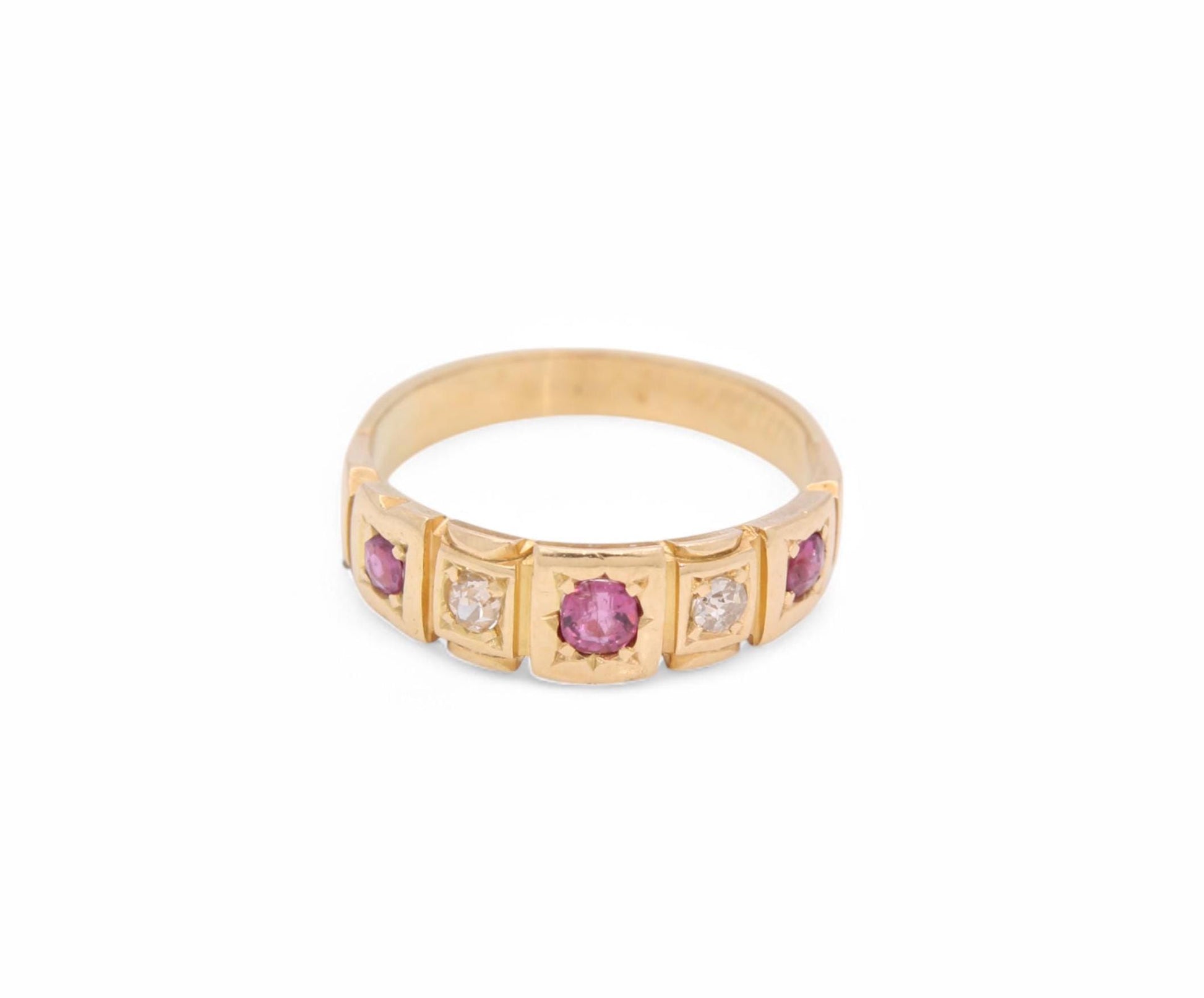 This antique 18ct gold gypsy-set ring, dating to the Victorian era, is a stunning piece. The ring features a central old mine cut 0.08ct ruby, two sparkling 0.03ct old mine cut diamonds, flanked with 0.02ct rubies set at the outer edges. The warm glow of the 18ct gold band beautifully complements the deep red hues of the rubies and the brilliance of the diamonds. A classic and elegant piece, perfect for collectors or those who appreciate the charm of antique jewellery.