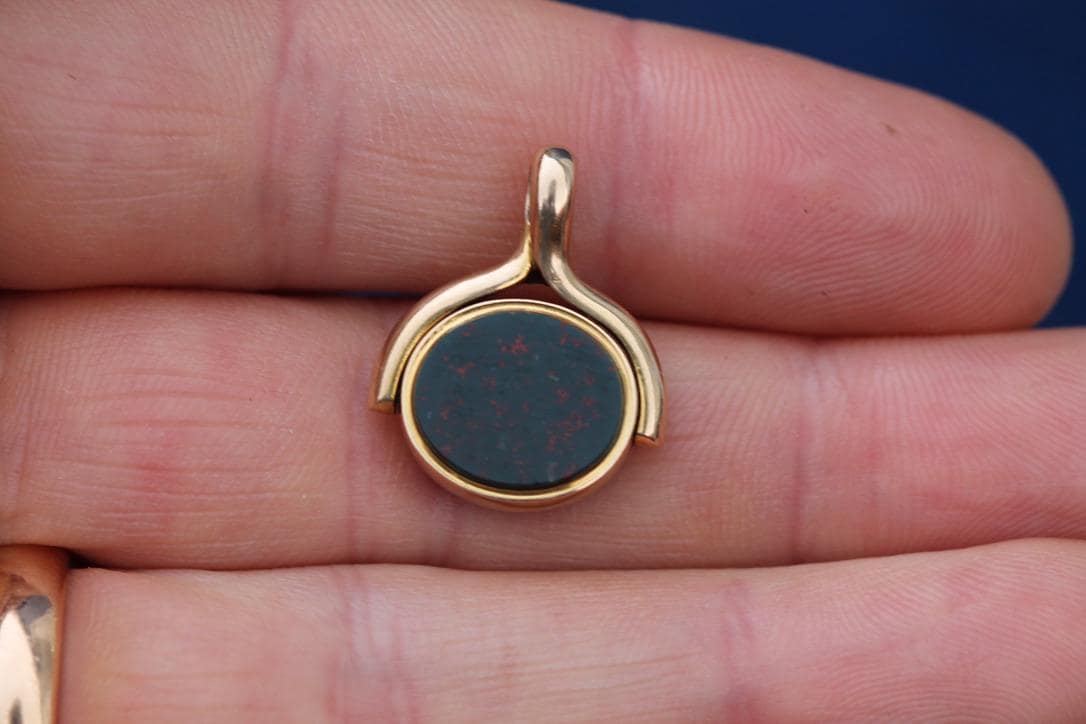 A striking antique Victorian 18ct gold spinner pendant, beautifully designed with a rich bloodstone set on one side and a warm sardonyx on the other. The spinner design allows the stones to rotate, creating an engaging and playful element while showcasing both gemstones.