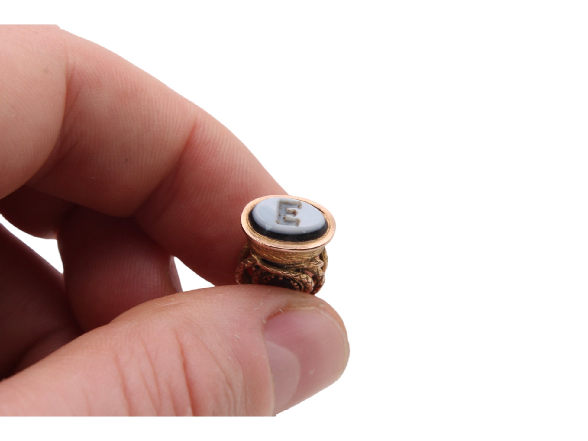 The almandine garnets are of lovely quality and are the centerpiece to this extraordinary antique. The base features a banded agate with the letter 'E' carved in.