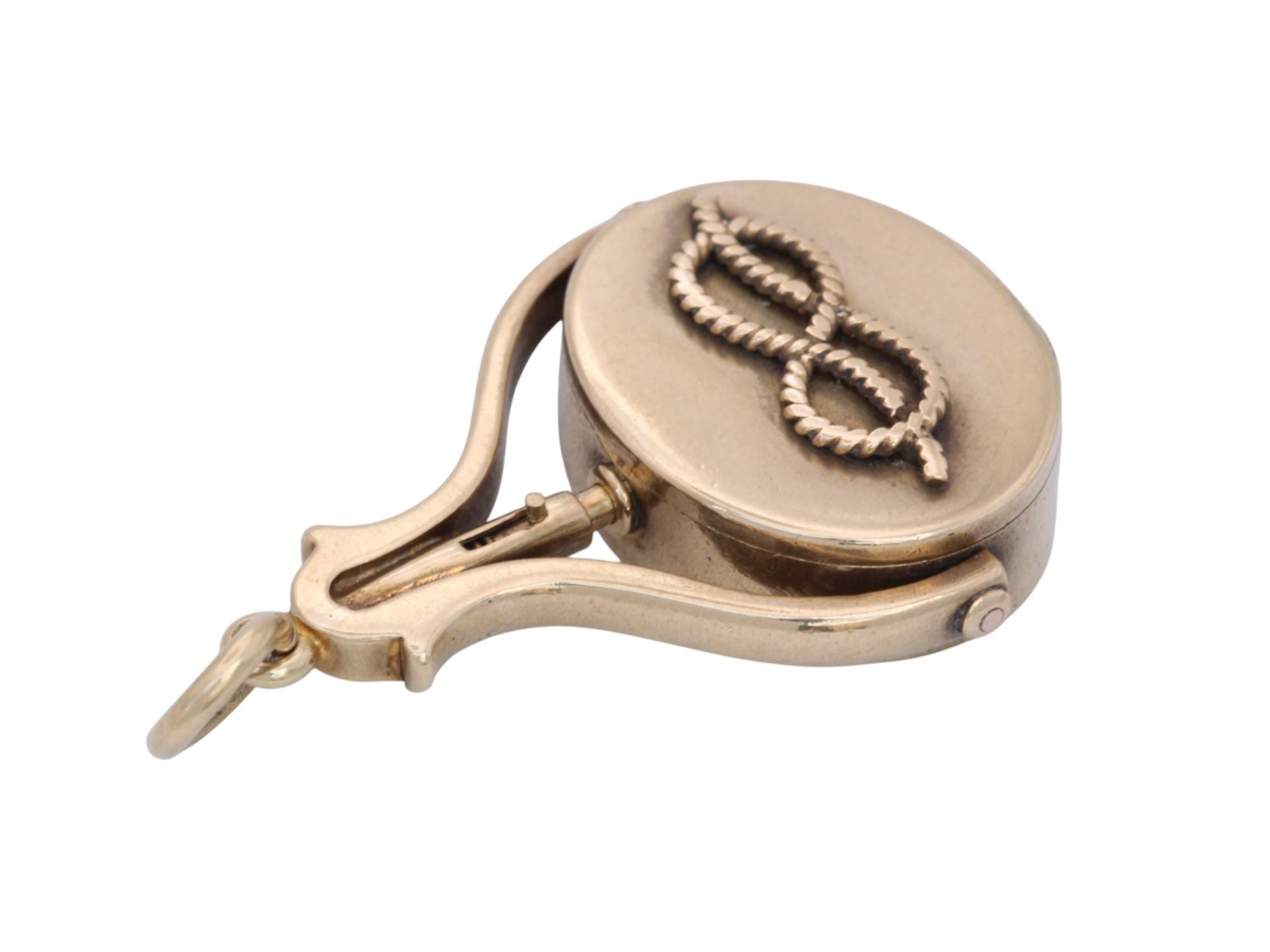 An exceptional and rare antique 18ct gold pendant, dating to c.1880, crafted in solid, rich yellow gold. The central body features a fine intaglio depicting a proud stag, a shield below with two lions, and the French motto "J’ay bonne cause" translating to "I have good cause". The reverse showcases a raised rope design formed into an elegant infinity-style knot. Ingeniously designed, the piece is secured by a pin clasp that allows the main body to rotate, revealing its secret. The front opens on a discreet hinge to uncover a working compass with a mother-of-pearl face, in perfect working order.