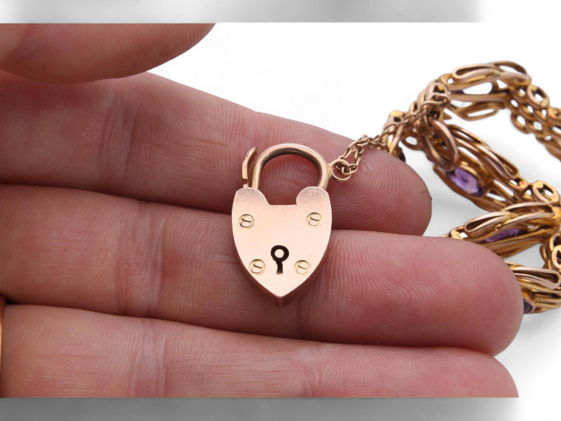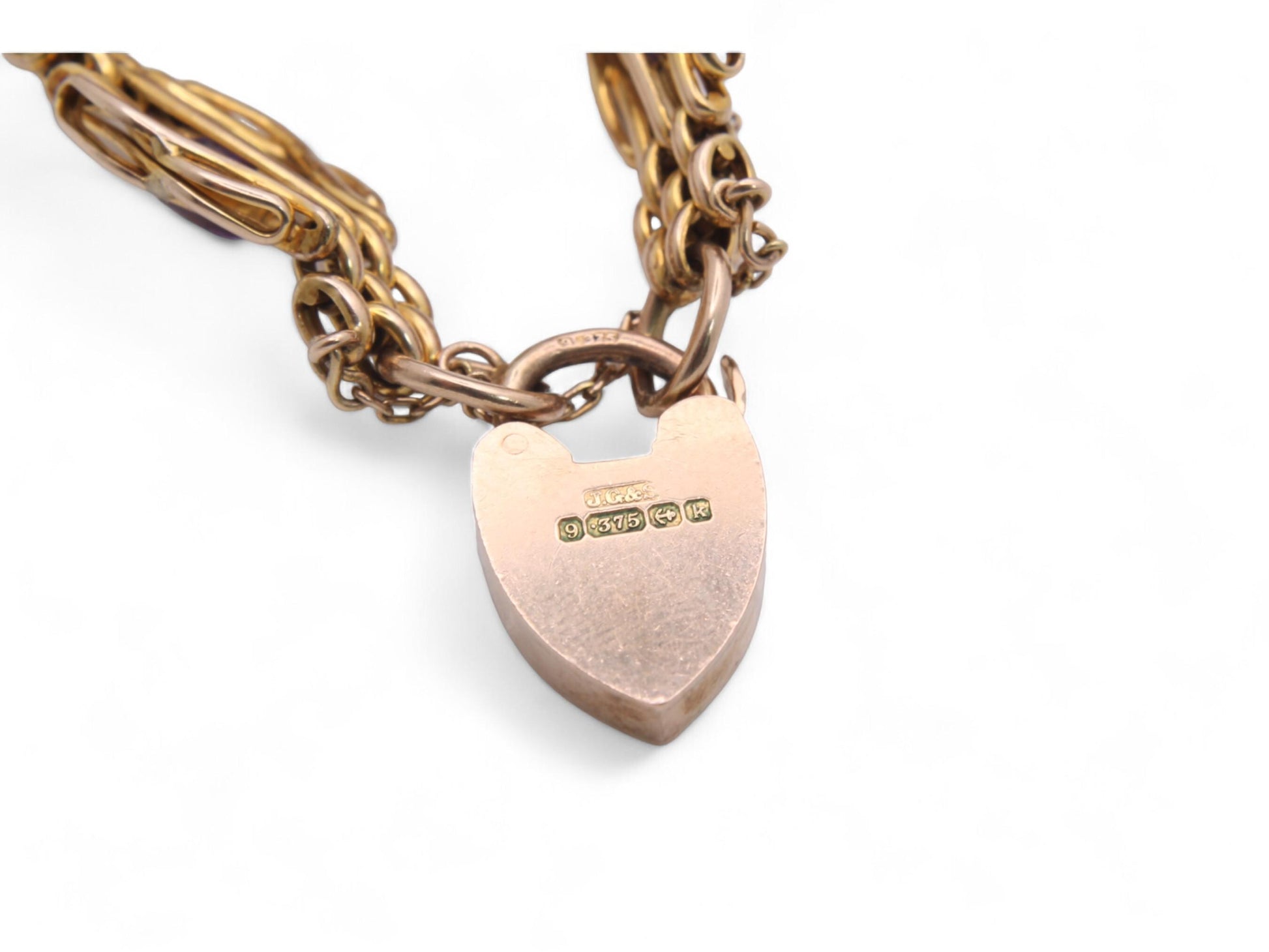 Antique 9ct Gold Amethyst Gate Bracelet With Heart Padlock, 19g
