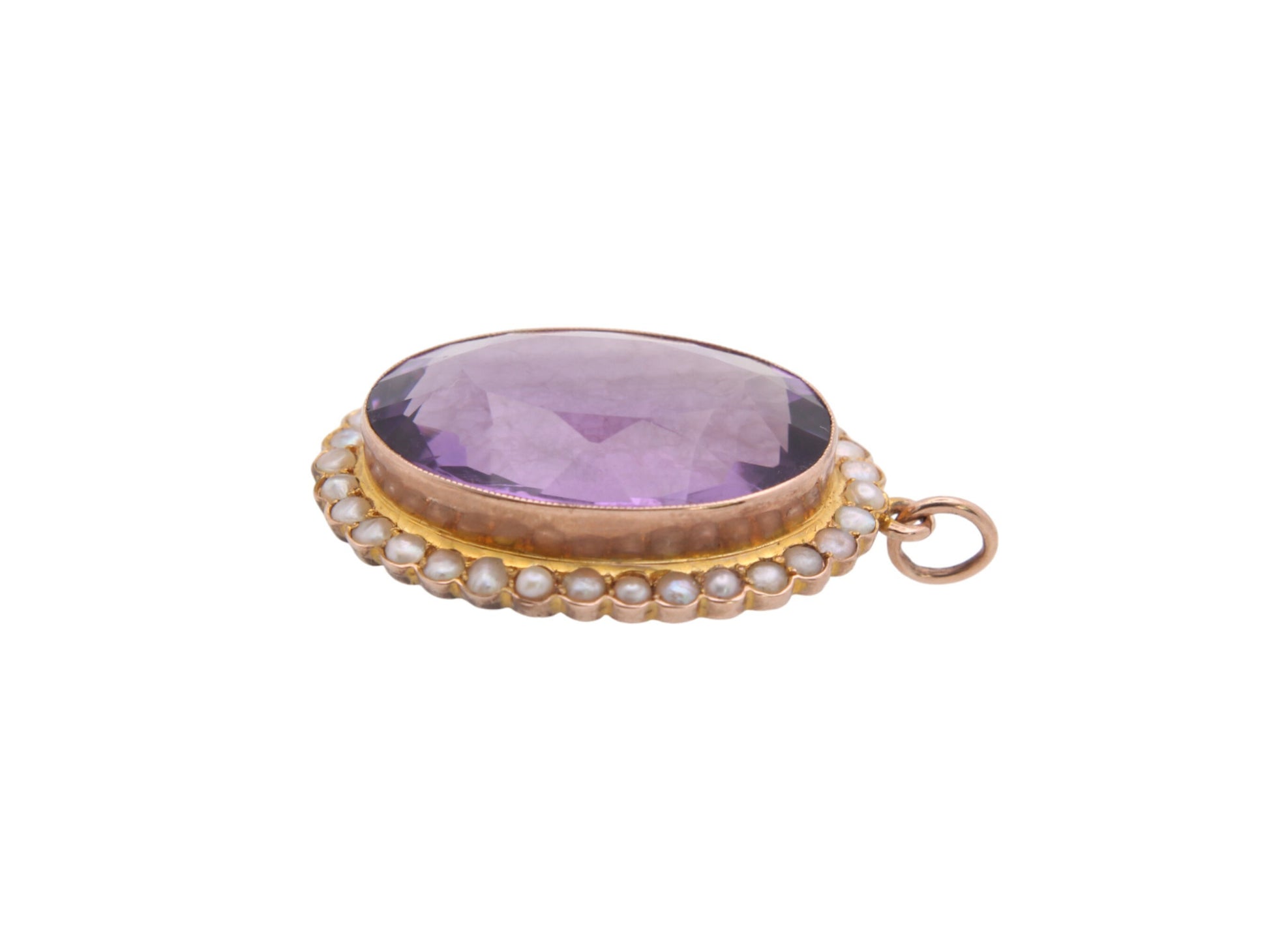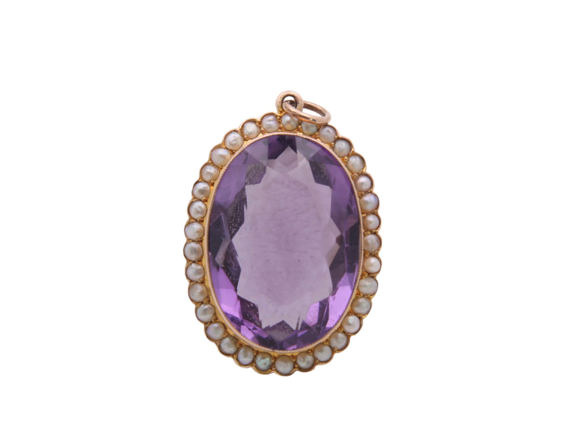 A majestic antique amethyst pendant set in 9ct yellow gold with gorgeous seed pearls surrounding it.