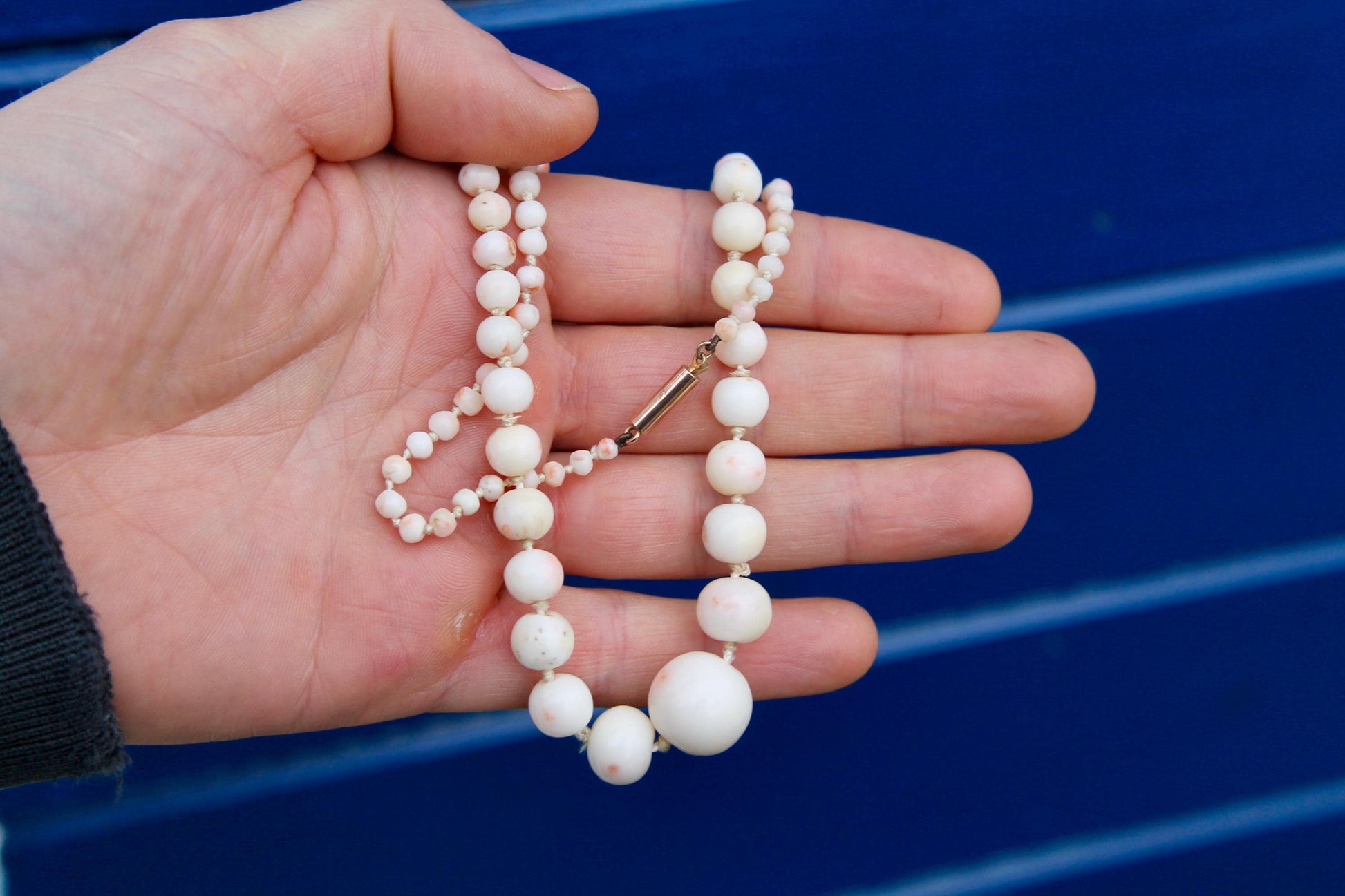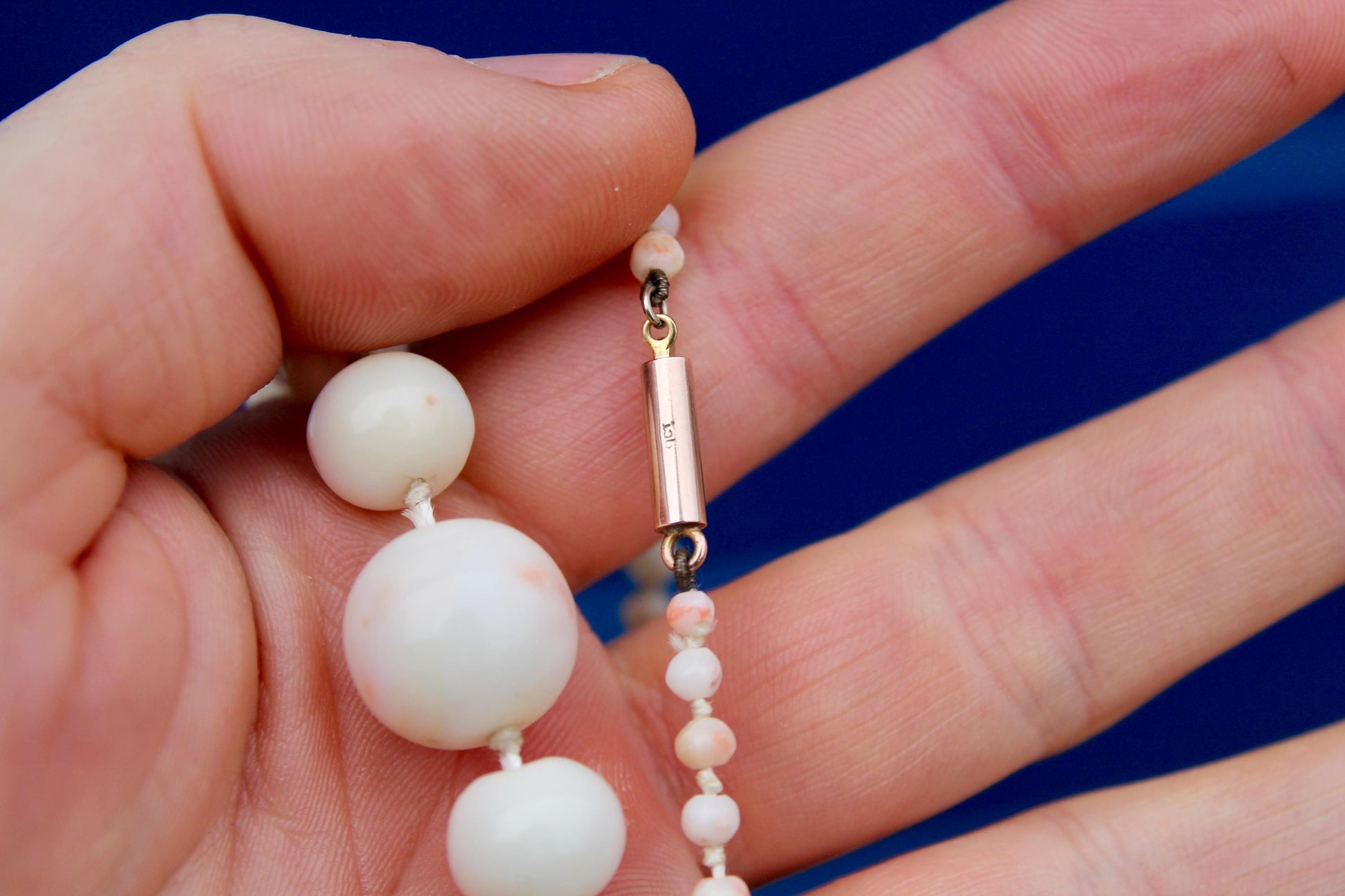 An exquisite Art Deco era necklace featuring angel skin coral beads arranged in a graduated design, with the largest beads at the base and the smallest near the clasp. The soft pink hue of the coral is beautifully complemented by the original 9ct gold barrel clasp, which remains in exceptional condition.