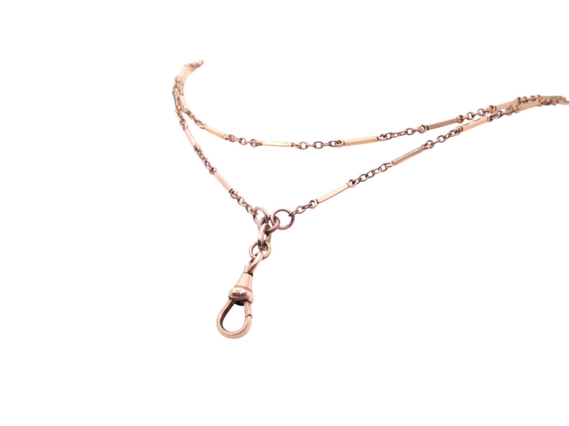 An exceptional antique 9ct rolled gold long guard chain with a slight rosy hue, dating to c.1900, featuring a rare and striking link design. The chain alternates bar-tabbed links with classic belcher links, creating a dynamic, textured look that catches the eye. Complete with its original dog clip, it is ready to wear or display with a locket or pendant.