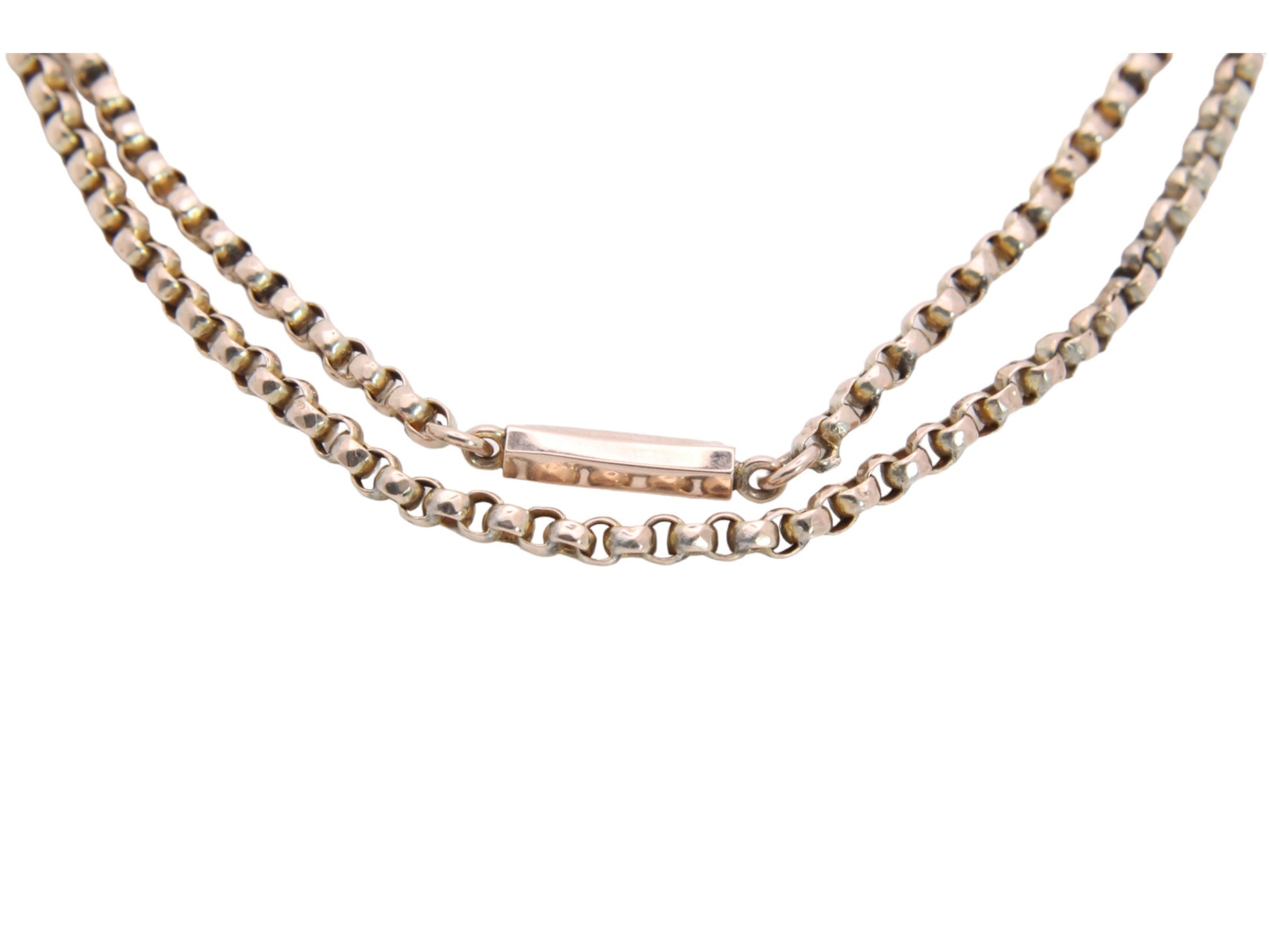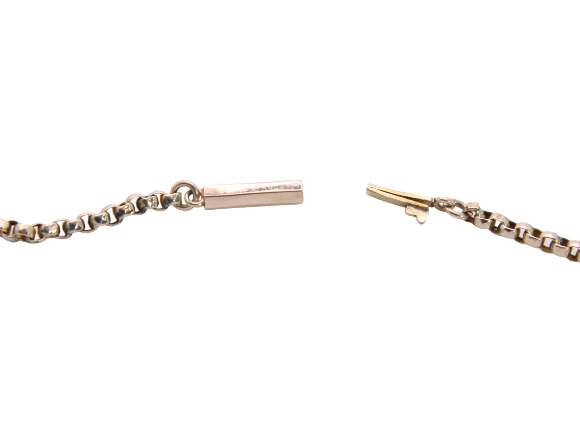 A delightful antique Edwardian 9ct rose gold necklace which is of beautiful quality. This exquisite piece features a series of delicate belcher links, each intricately crafted to create a seamless flow of beauty and grace.