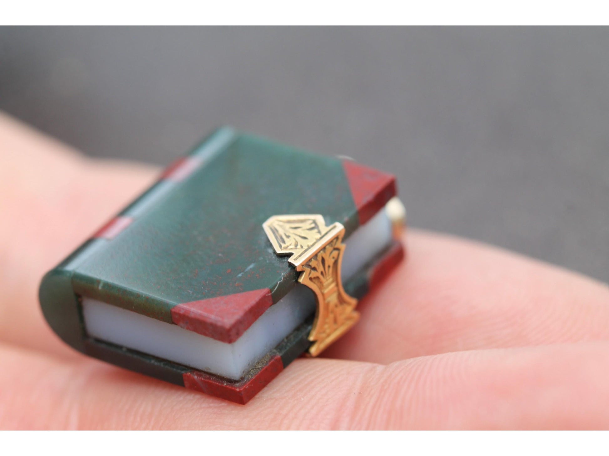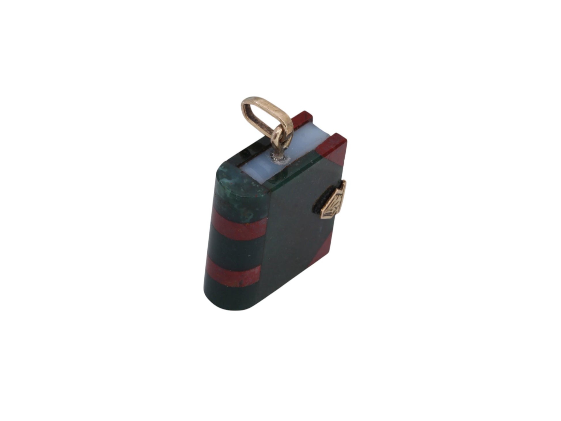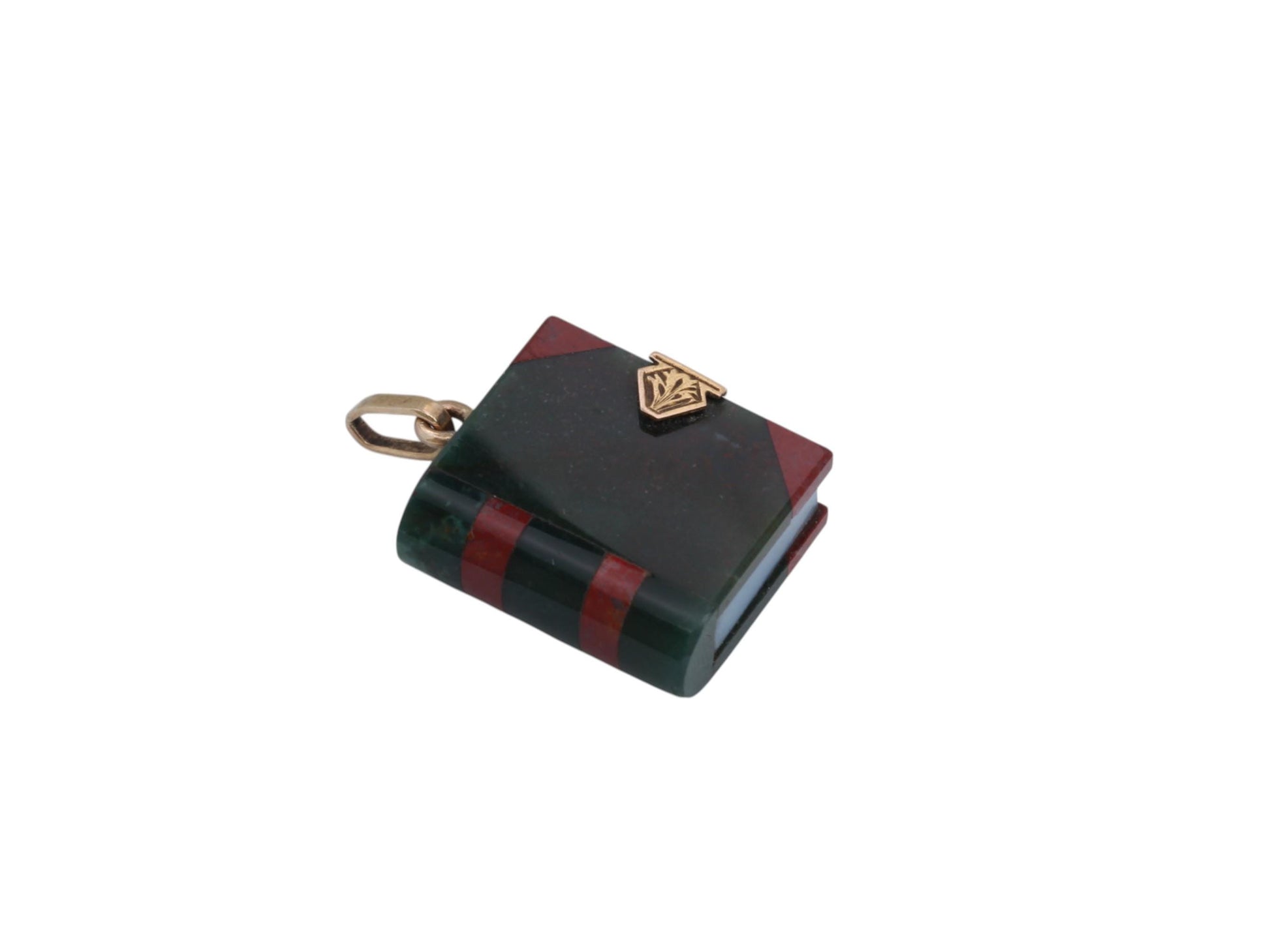 A rare and remarkable antique pendant dating to the late Victorian era, masterfully crafted in the form of a miniature book. The cover is made from rich bloodstone, while corners and spine details are accented with warm carnelian, and a slice of milky chalcedony through the centre cleverly mimics the book's pages. The clasp is finished with a chased 9ct gold piece, giving the illusion of a working book lock. A truly unusual and symbolic Victorian piece, representing knowledge, love of learning, or personal stories kept close to the heart.