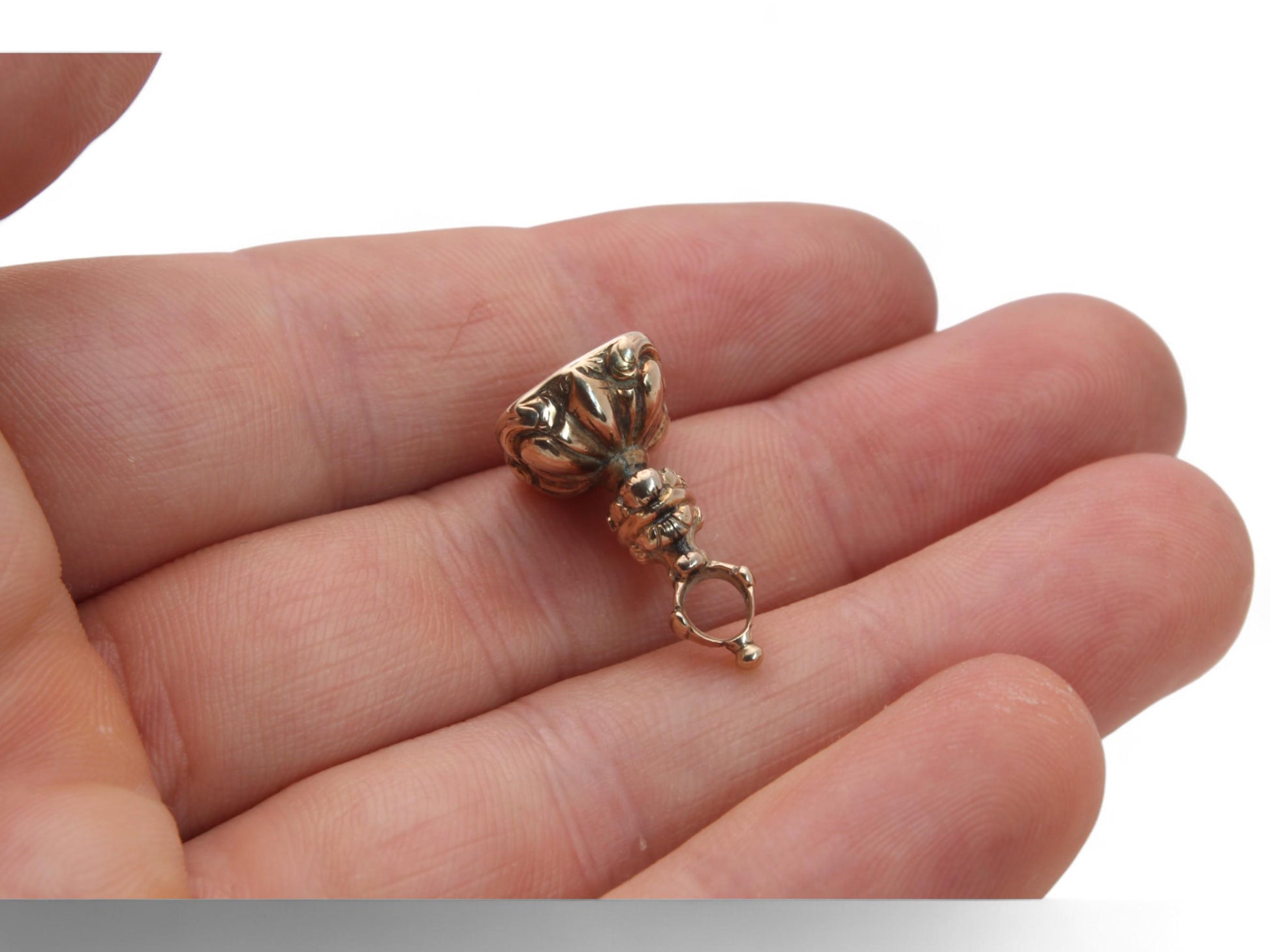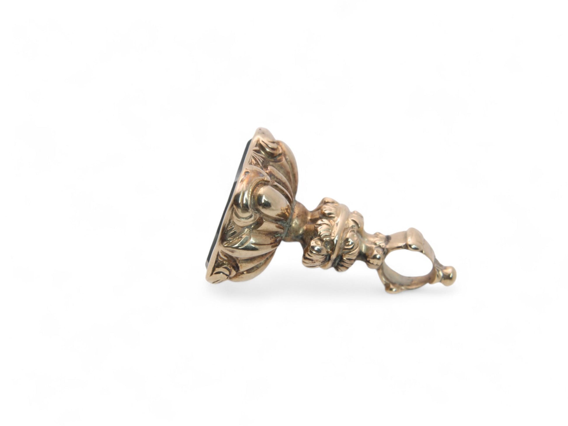 This elegant antique 9ct yellow gold seal pendant is a true treasure, featuring a shield-shaped bloodstone at its base. The rich, deep green bloodstone adds a touch of sophistication to the piece, perfectly complementing the warm tones of the yellow gold.
