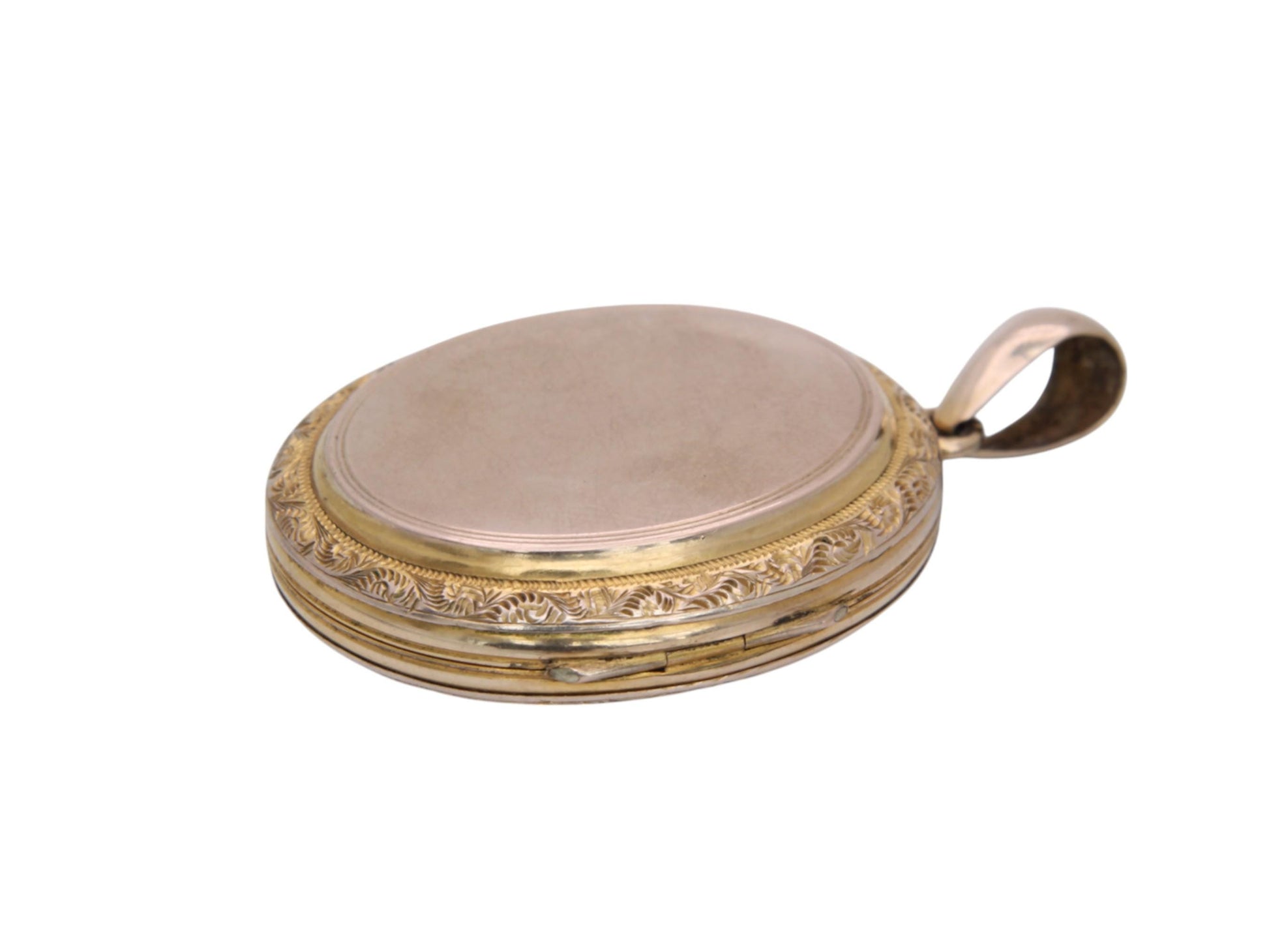 Unmarked, tests as 9ct gold front and back. Some internal parts may well be made from a base metal which was very common in the Victorian era.