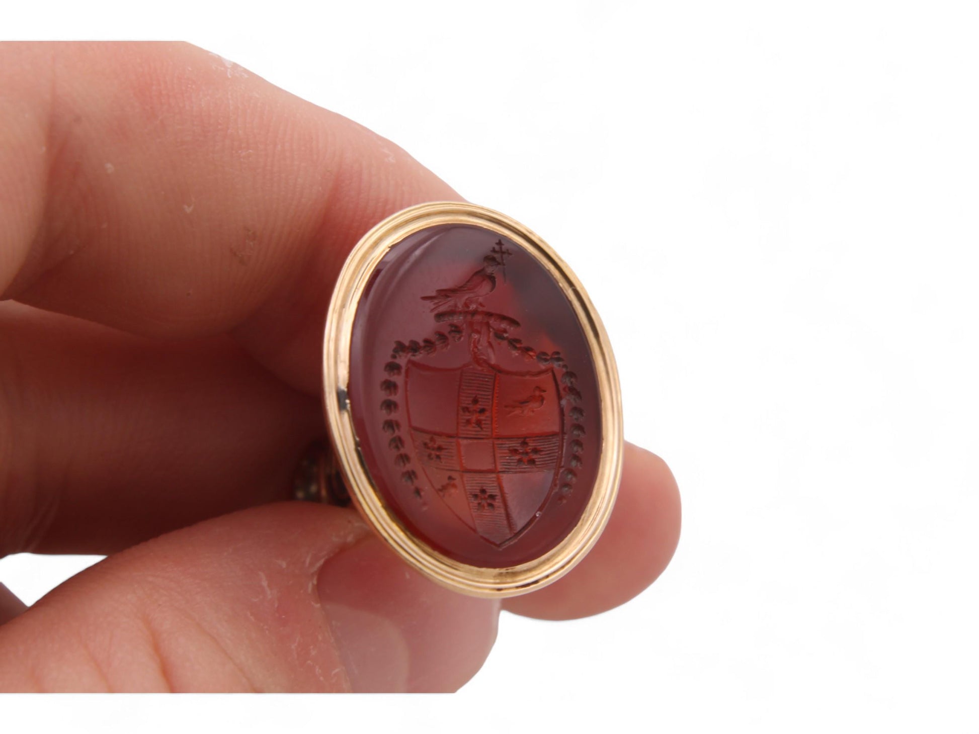 This antique 9ct gold pendant is a striking and symbolic piece of Victorian-era craftsmanship, dating to around 1880. The base features a rich carnelian intaglio, intricately carved with a falcon holding a cross atop a shield-shaped coat of arms, representing power and faith.