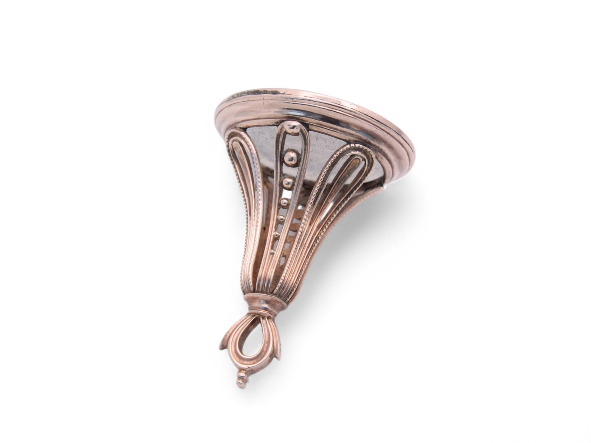 A striking antique pendant crafted in 9ct gold with a warm rose hue, dating to the Victorian era, c.1880. This beautifully made piece features a hand-carved chalcedony intaglio crest with intricate details. It bears a shield adorned with a scythe and fleur-de-lis, while the other side presents an arrangement of religious crosses. Rich in symbolism and Victorian craftsmanship, this piece would have originally been worn on a watch chain but now makes a fantastic pendant or collector’s item.