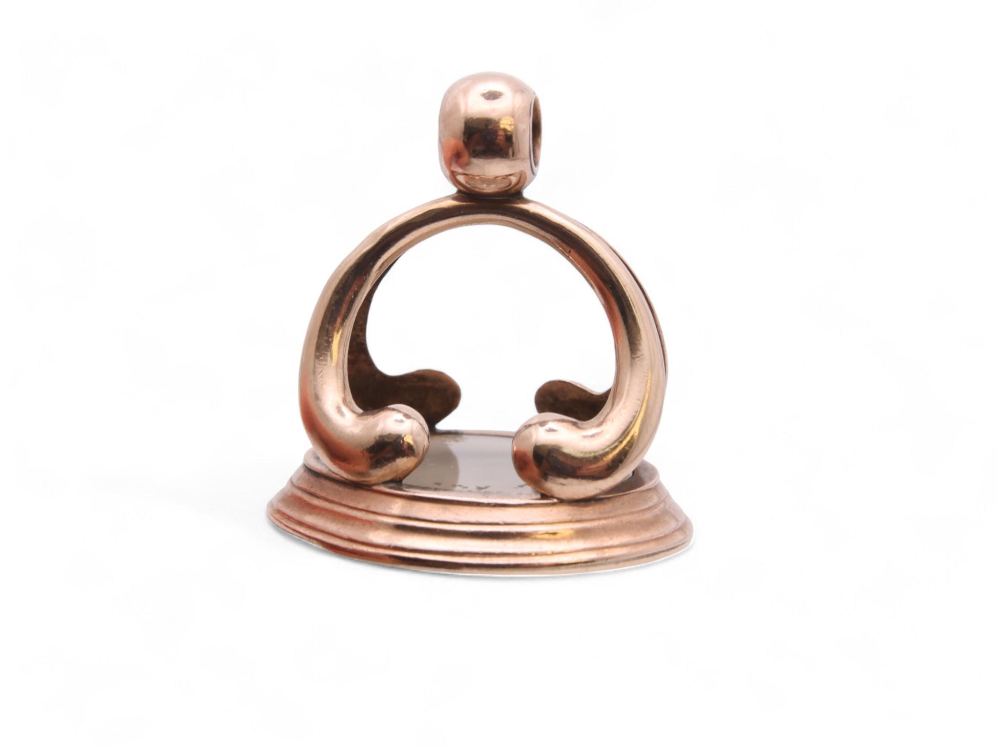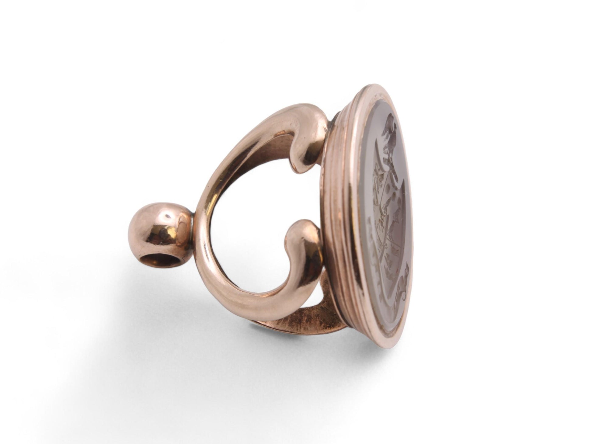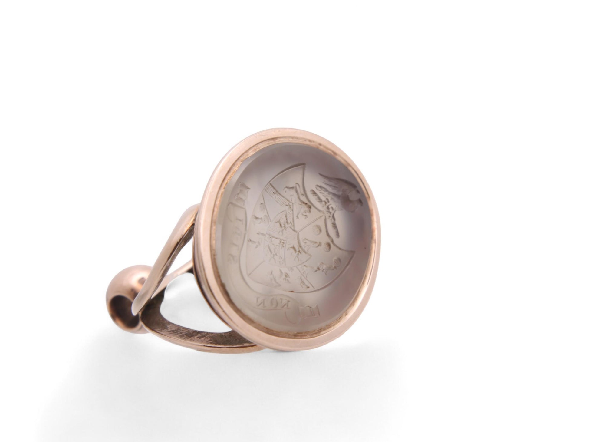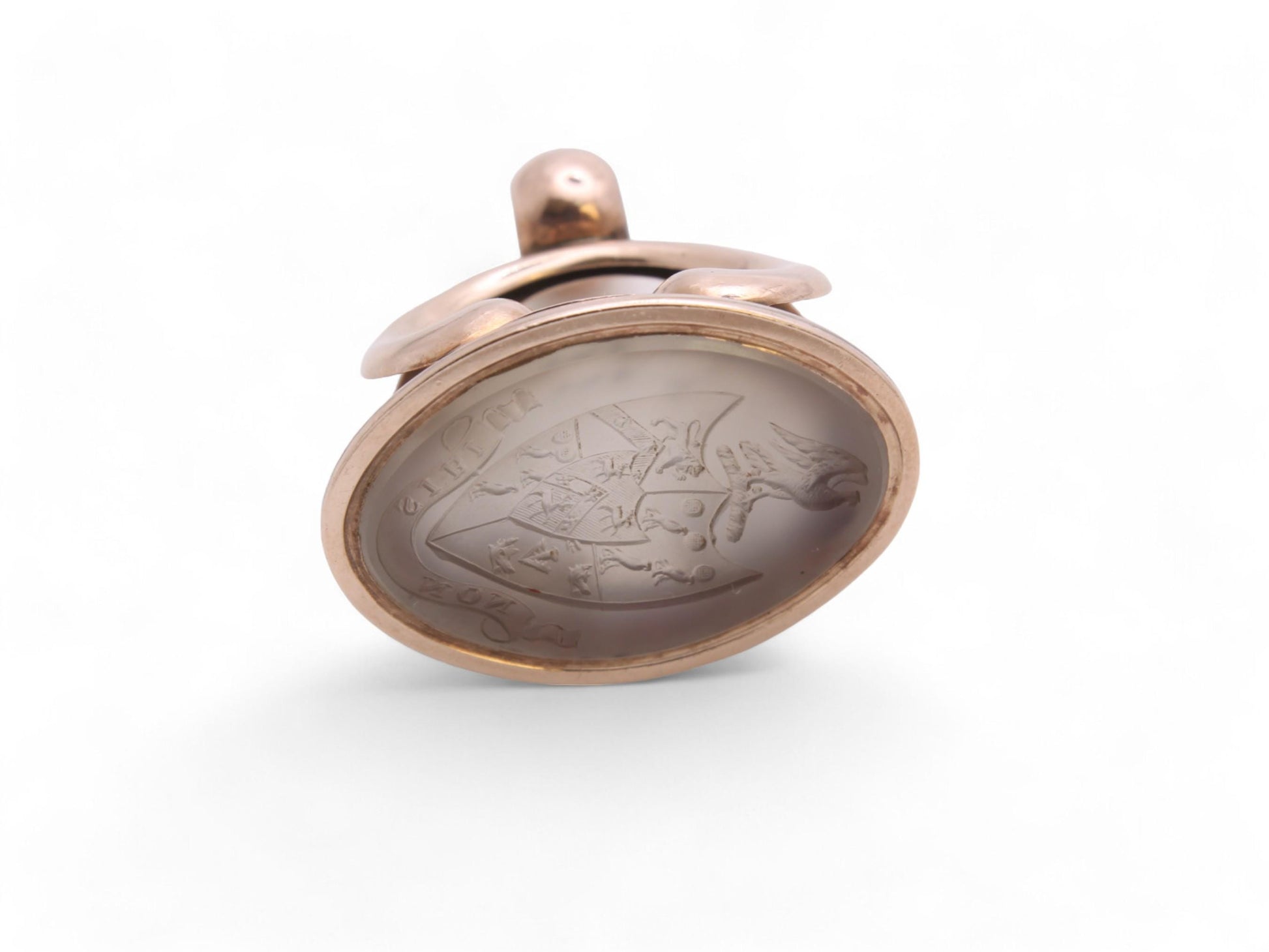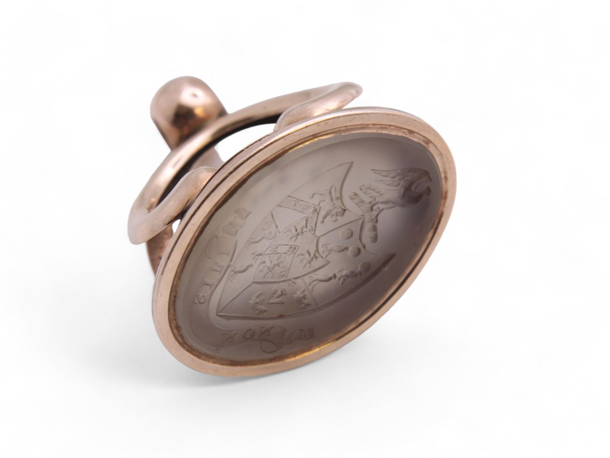 This stunning antique 9ct rose gold pendant seal is a remarkable piece of artistry and history. At its center lies a captivating chalcedony stone, featuring an intricately carved intaglio crest of an Phoenix upon a shield. The shield is beautifully detailed, showcasing a majestic lion, a falcon, a deer, and a boar's head in each sector, symbolizing strength, nobility, and courage. Below this exquisite crest, the motto "NON SIBI" which translates to "Not For Oneself".