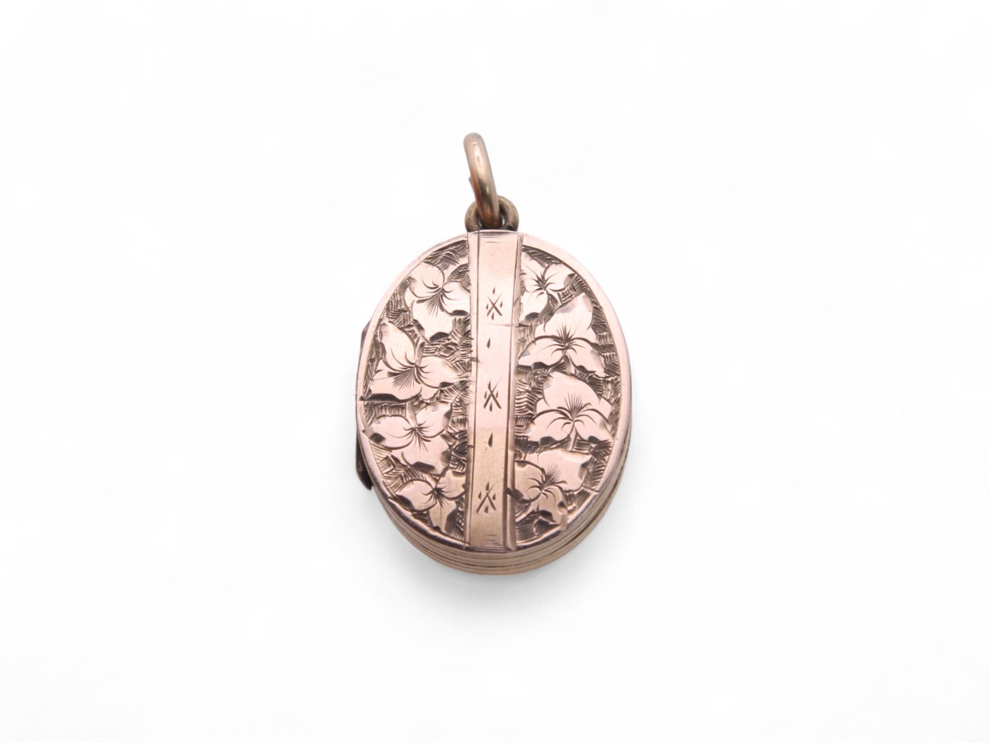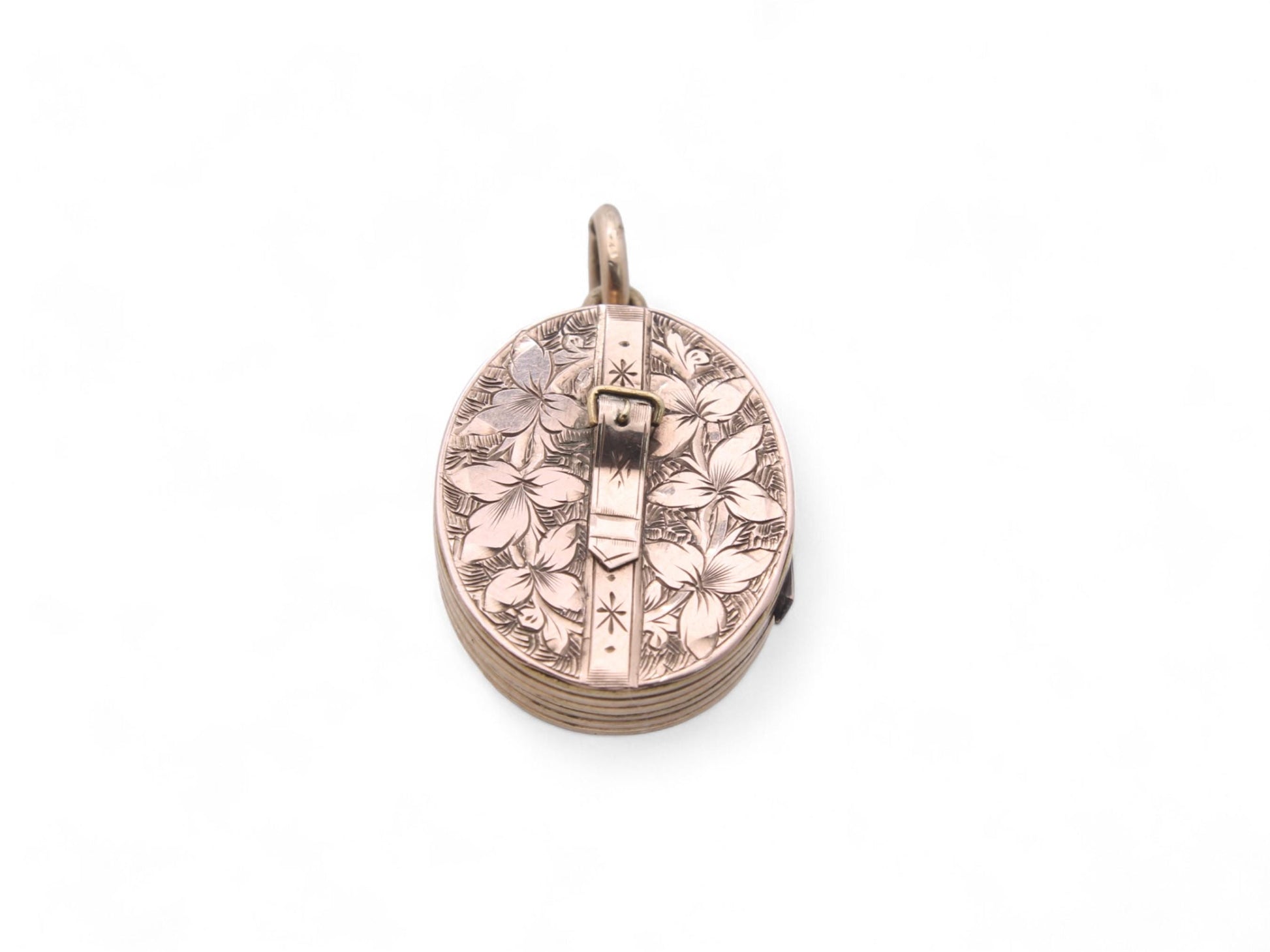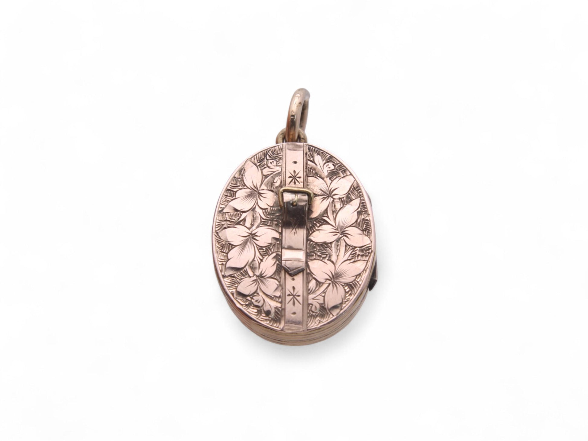 This antique 9ct gold locket is a captivating piece, adorned with beautifully chased open-bloom flowers on both the front and back. At the center, a raised, three-dimensional belt and buckle motif adds a touch of Victorian charm and intricate detail.