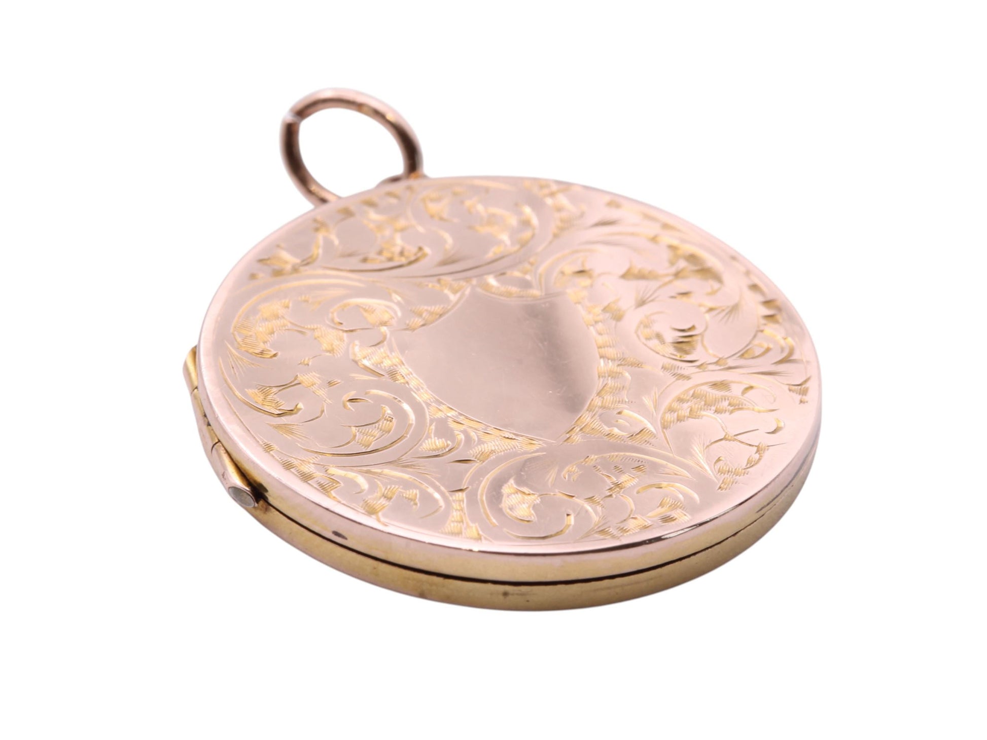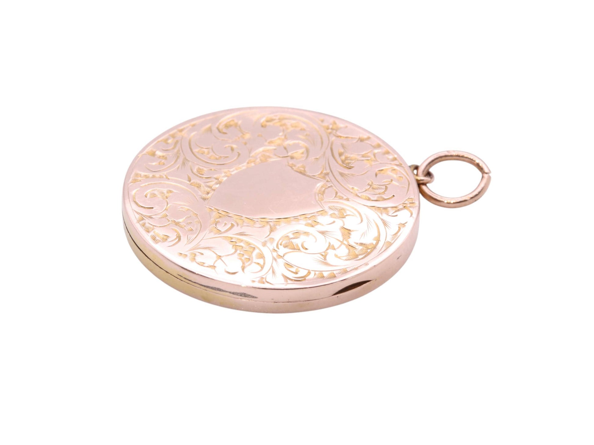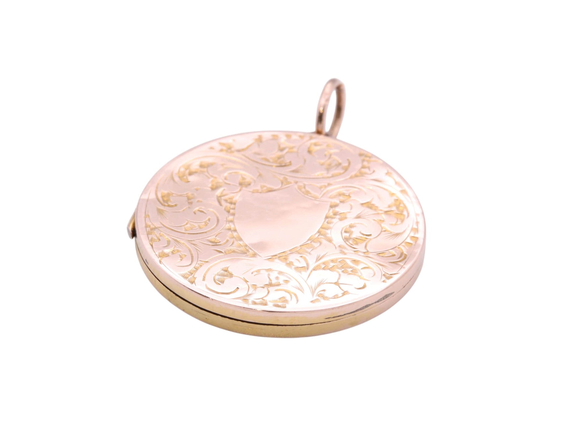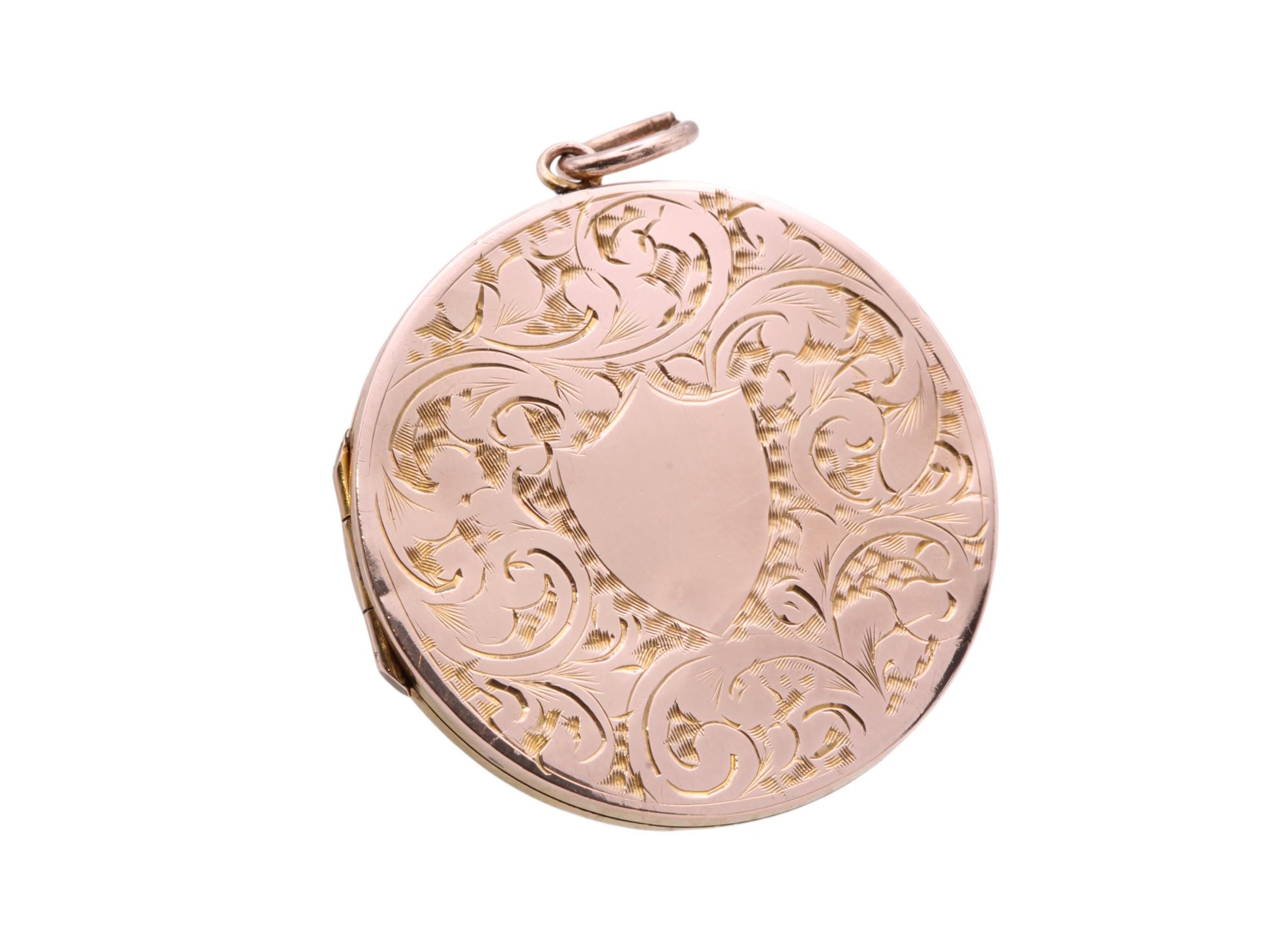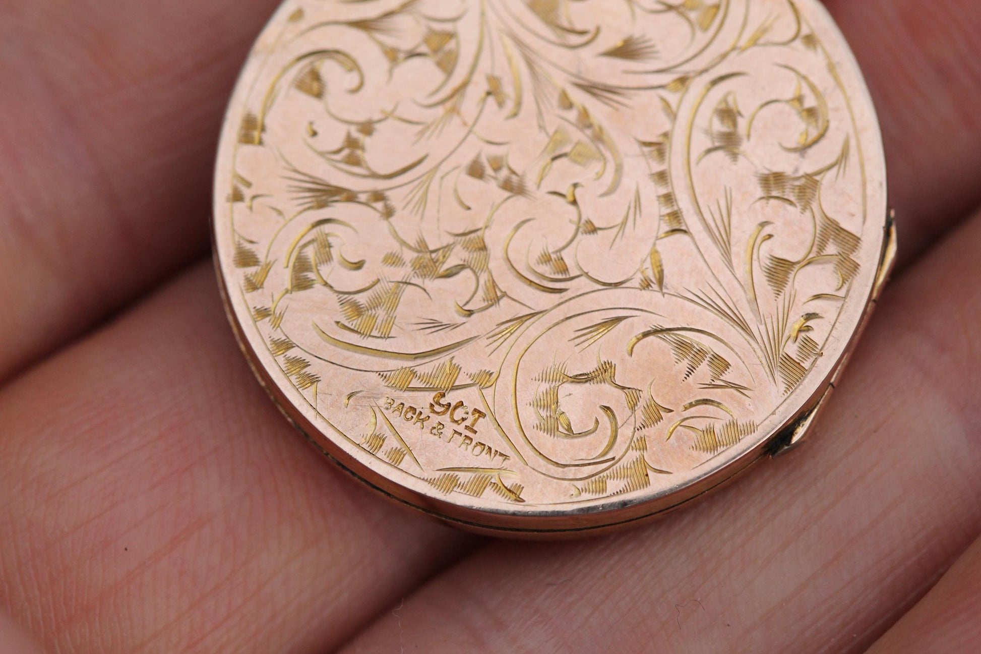 An antique 9ct rose gold locket dating to the Edwardian era, finely decorated with floral chasing to both front and back. The warm tone of the rose gold complements the delicate engraving, giving the piece depth and texture from every angle.