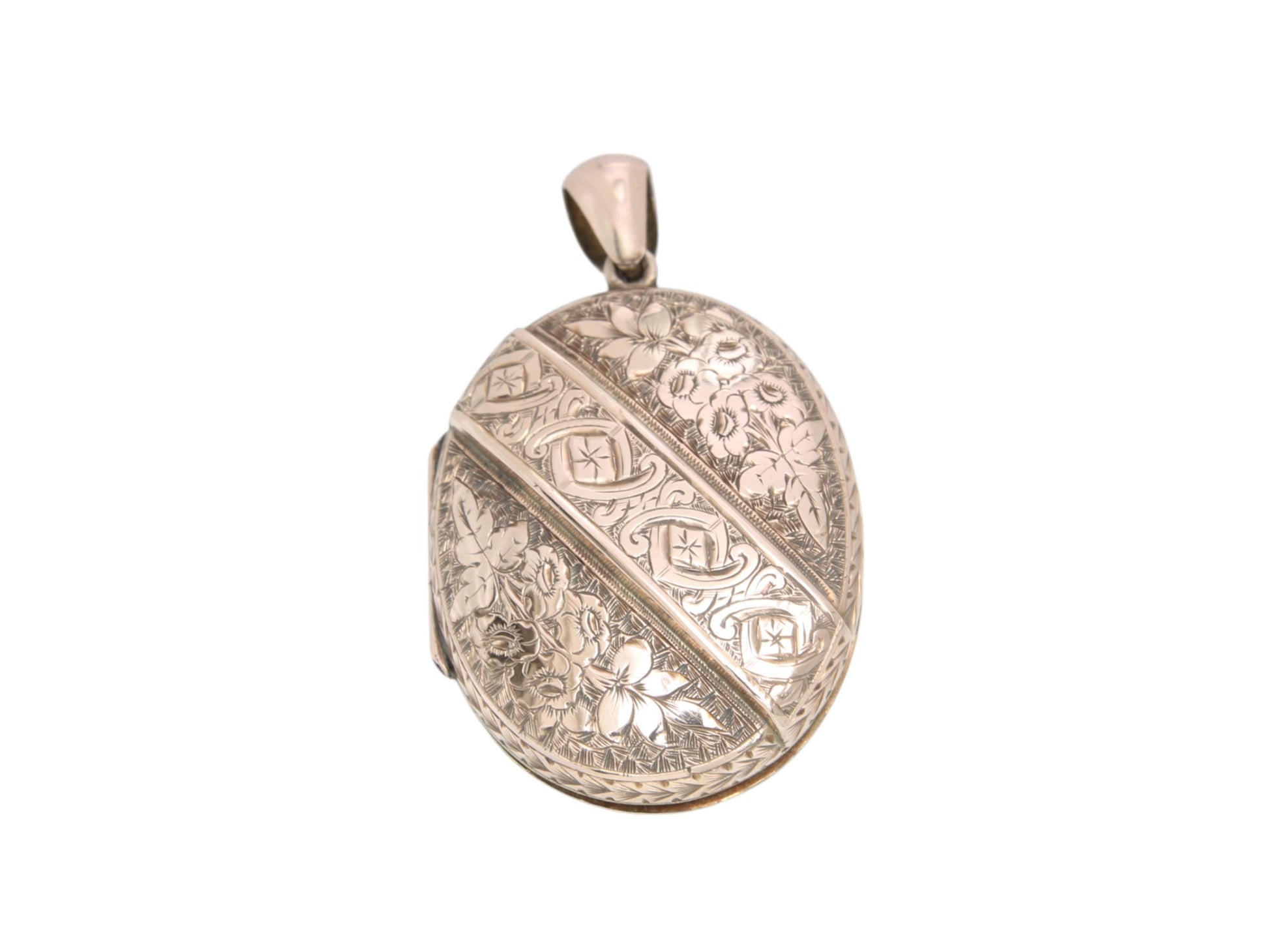 A beautiful antique 9ct gold locket dating to c.1880, richly detailed with exquisite chased floral work. The front of the locket showcases a stunning design Forget Me Nots, delicately crafted with exceptional precision and artistry. The reverse is equally striking, featuring an intricate chased pattern that adds texture and elegance from every angle.