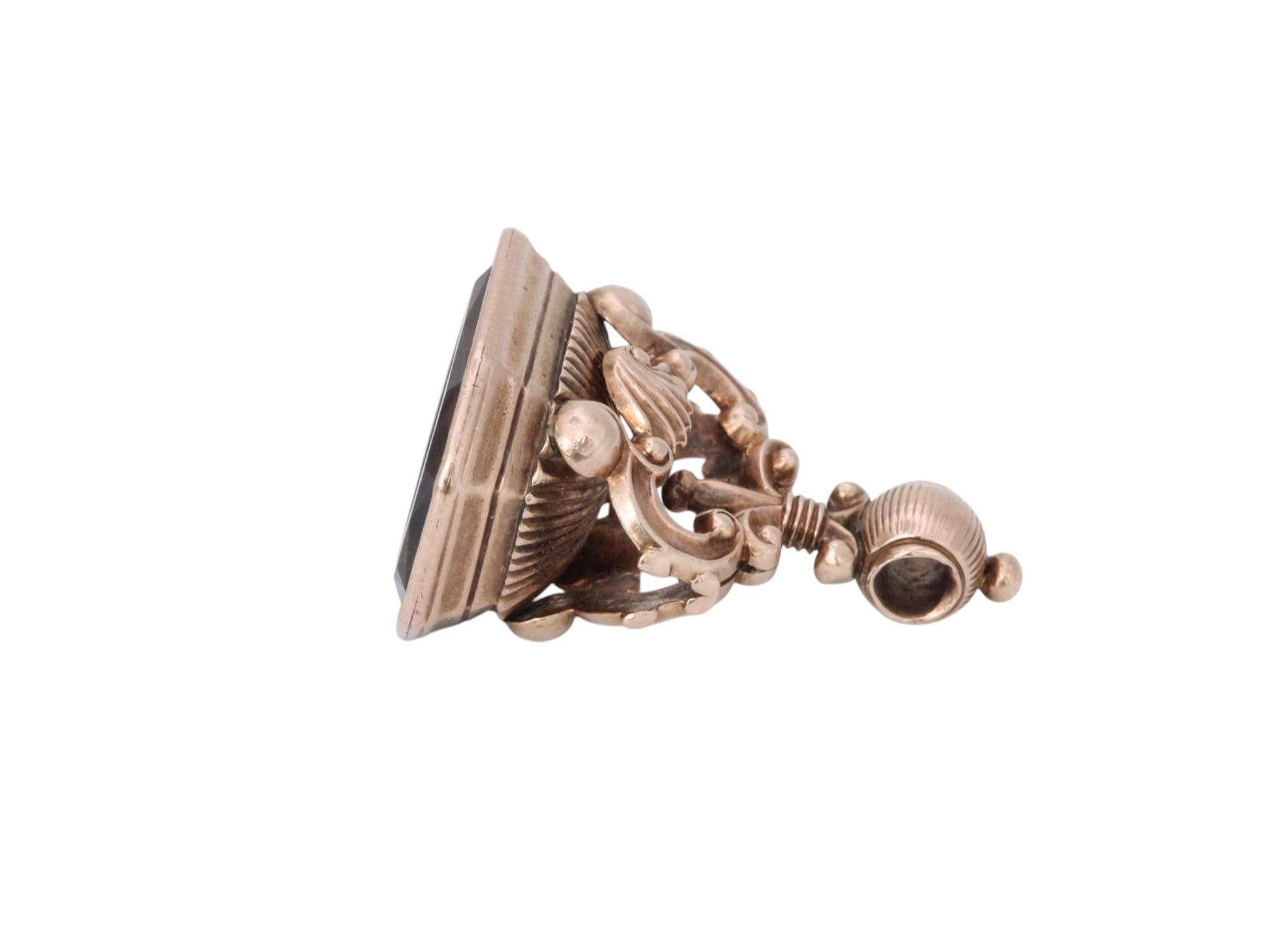 A stunning Victorian 9ct gold seal dating to c.1880. The base is set with a smoky citrine intaglio, intricately carved with a heraldic shield featuring a boar and two stars above. The gold mount is solid and well-crafted, with only light wear to the eyelet where a hoop/jump ring would have once been attached.