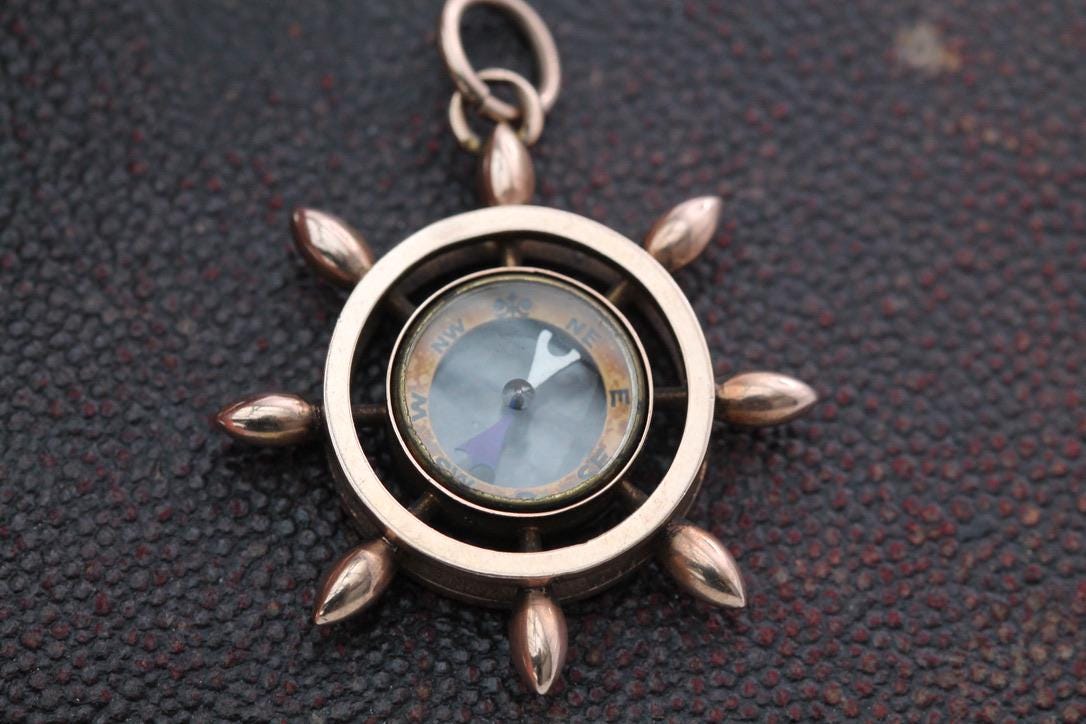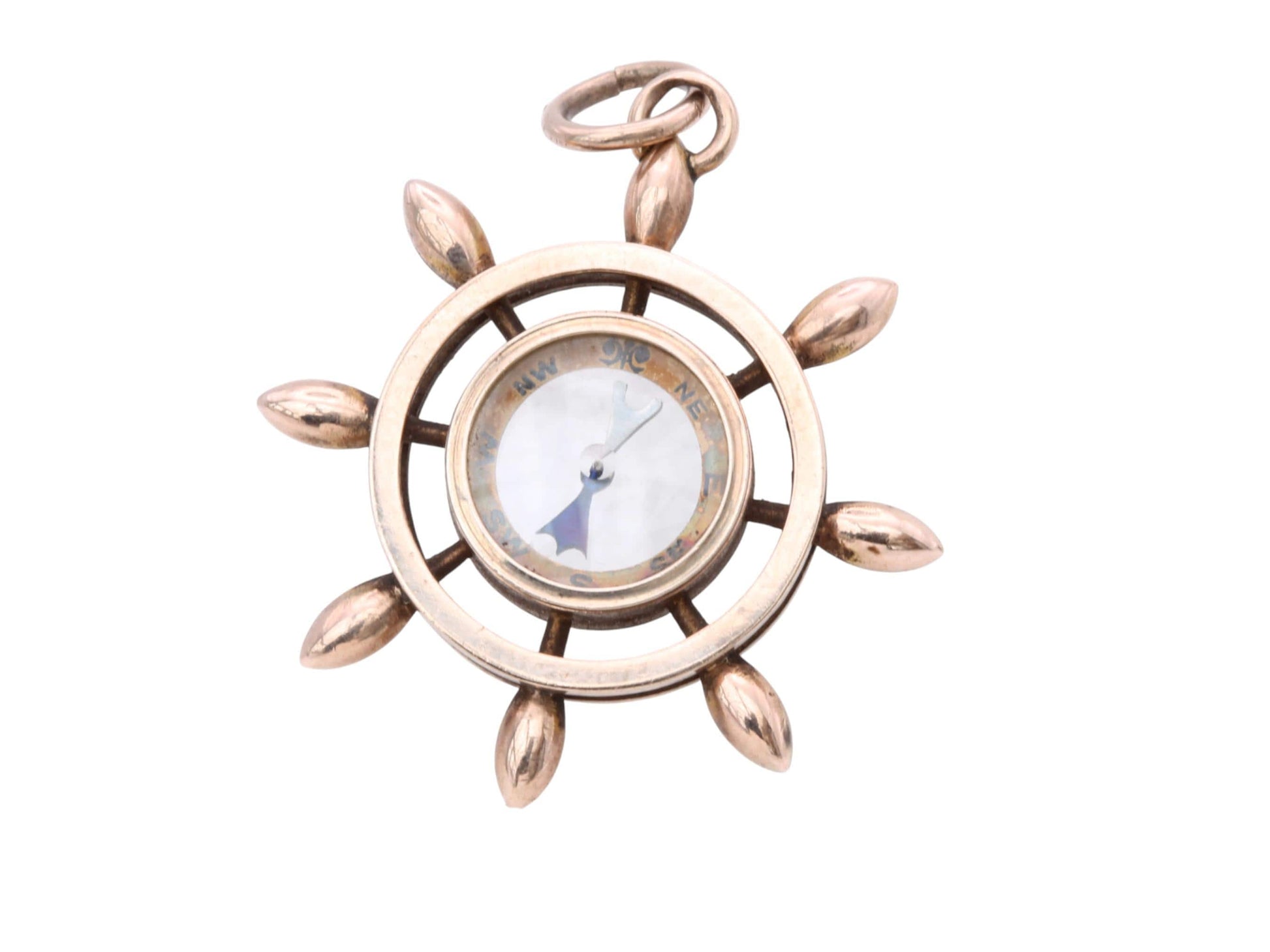 A delightful antique 9ct rose gold compass pendant, crafted in the shape of a ship’s wheel — a wonderful maritime-inspired design.